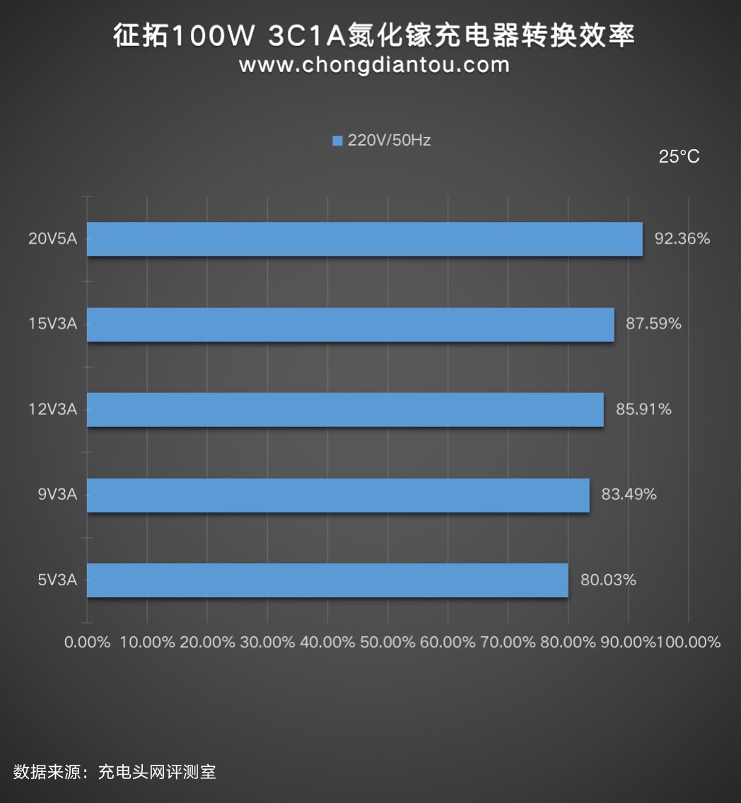 220V 50Hz下,將征拓100W 3C1A氮化鎵充電器在各個電壓檔位的輸出功率拉滿進行測試:五個檔位測得插線板AC端輸入功率和USB端輸出功率,通過計算,可得充電器的轉(zhuǎn)換效率從80.03%到92.36%不等。