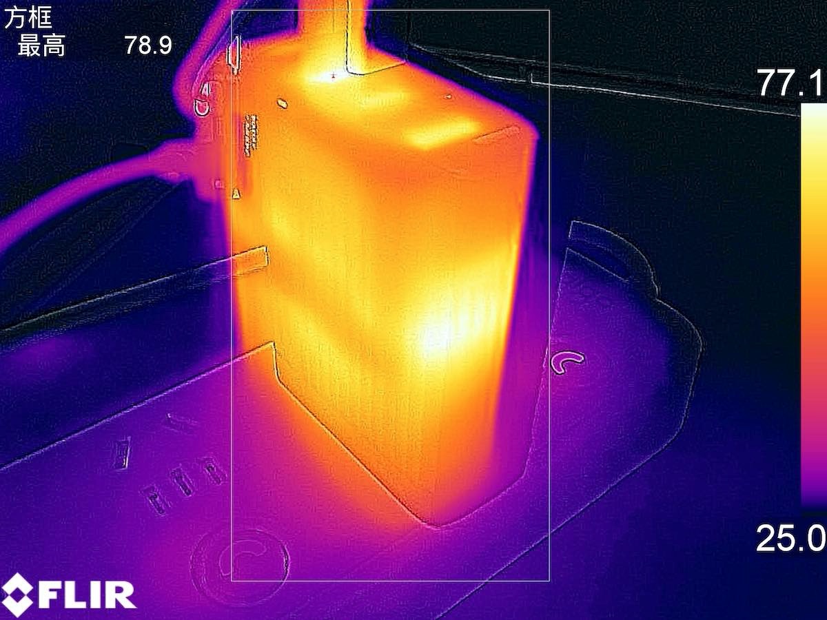 作為參照,滿載一小時測試中,低功率密度的氮化鎵充電器滿載溫度一般在60-70度之間,而高功率密度的單口氮化鎵充電器一般在70度左右,高功率密度的多口氮化鎵充電器溫度一般都會超過70度。