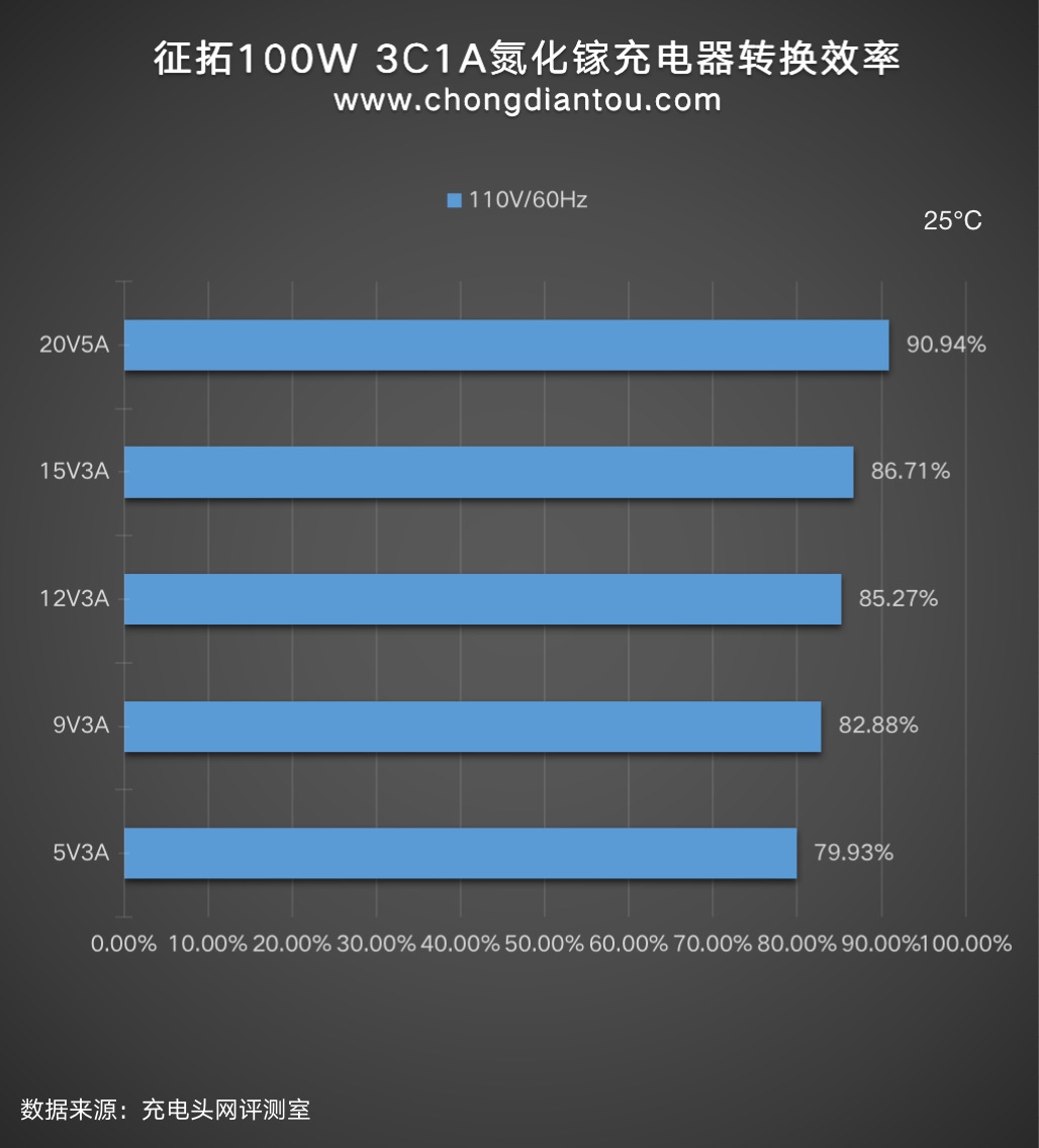 110V 60Hz下,充電器的轉(zhuǎn)換效率從79.93%到90.94%不等。