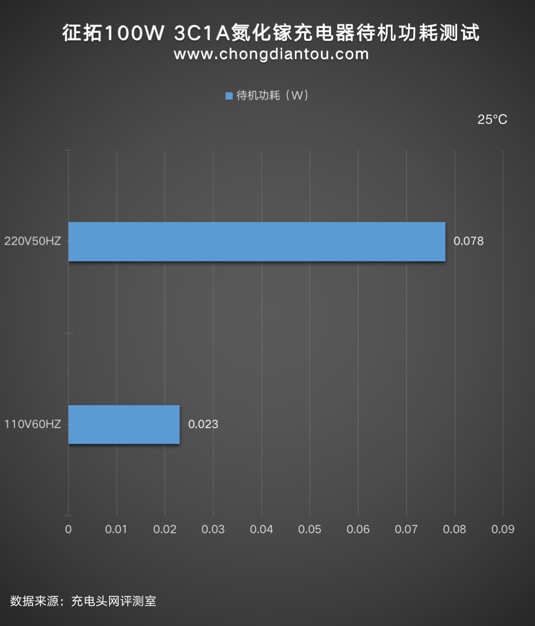 經(jīng)過功率計測試,征拓100W 3C1A氮化鎵充電器在220V 50Hz的空載功耗為0.078W,換算下來一年損耗的電能約為1.87KW·h,若市價電為0.6元/KW·h,則充電器一年的空載功耗約為1.12元左右。