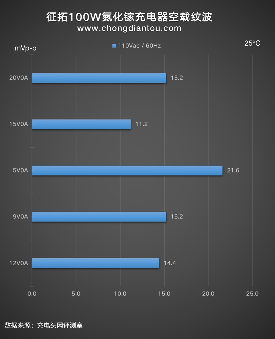 國家標準中充電器紋波要求是不高于200mVp-p,征拓100W 3C1A氮化鎵充電器在110V 60Hz、240V 50Hz輸入電壓下,所有輸出功率紋波峰峰值均低于200mVp-p這個標準很多,表現(xiàn)不錯。