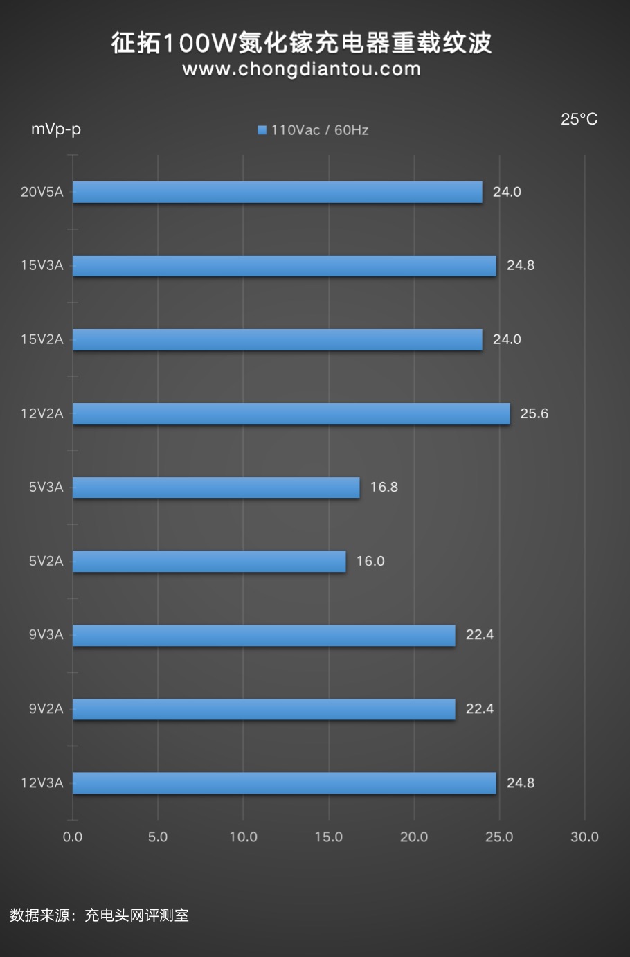 重載情況下:九個檔位輸出時紋波峰峰值從16mVp-p到25.6mVp-p不等。