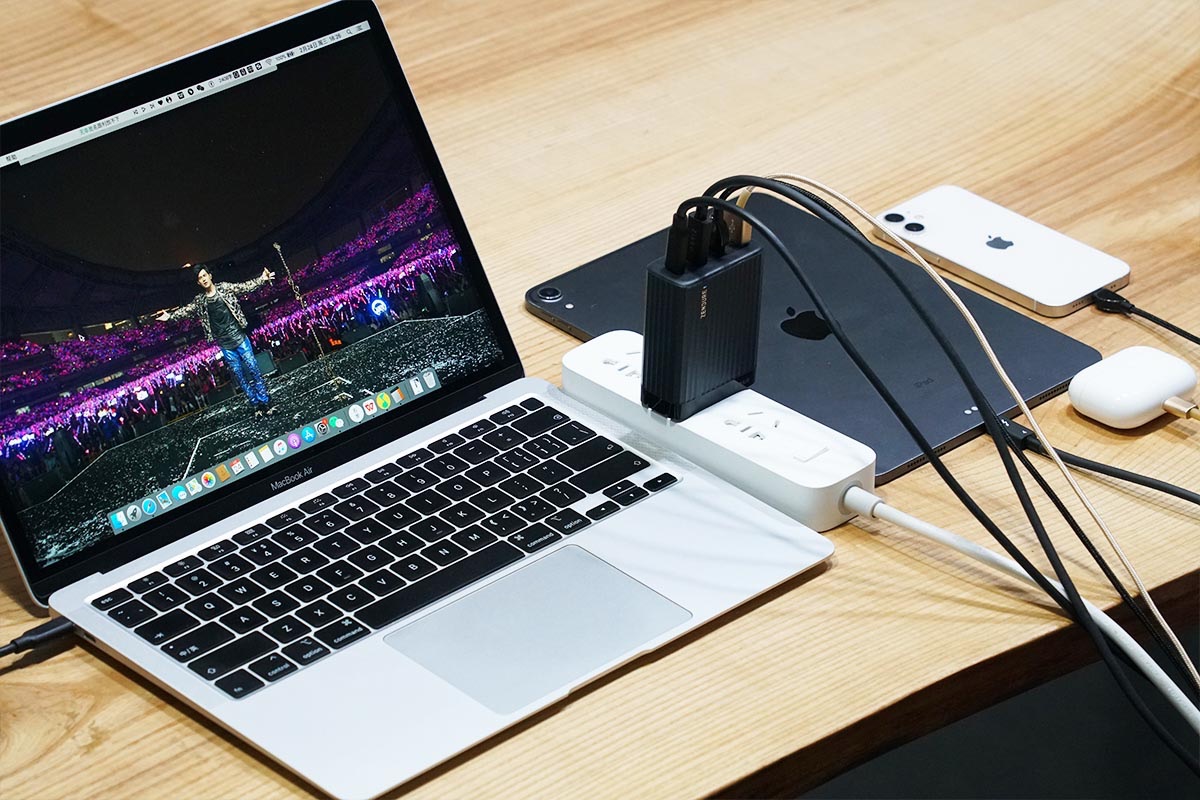 使用USB-C1和USB-C2同時為筆電充電,功率分別為50.65W,27.82W;同時使用USB-A為iPad充電,功率為19.21W。充電器支持USB-C1、USB-C2和USB-C3同時輸出,功率分配為60W+30W+20W。