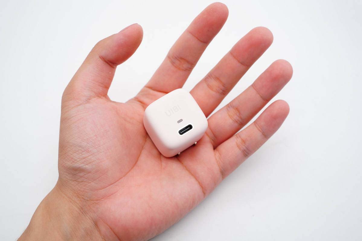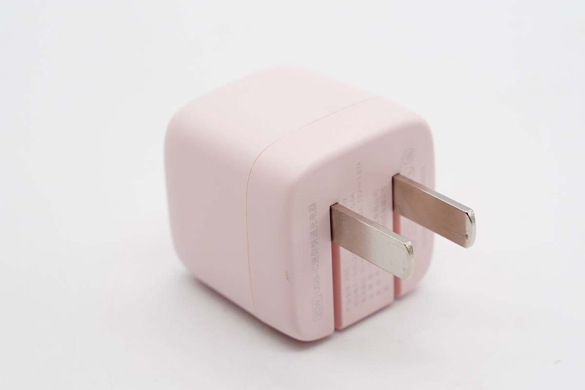 充電器采用小方塊造型設計,機身殼表面啞光,邊角過渡圓潤,上手體驗感好,同時整體顏值也非常高。這也是市場上極少的實物比渲染圖更漂亮的產品,拿在手里真的是讓小編愛不釋手,說它是20W功率段的顏值擔當一點也不為過。