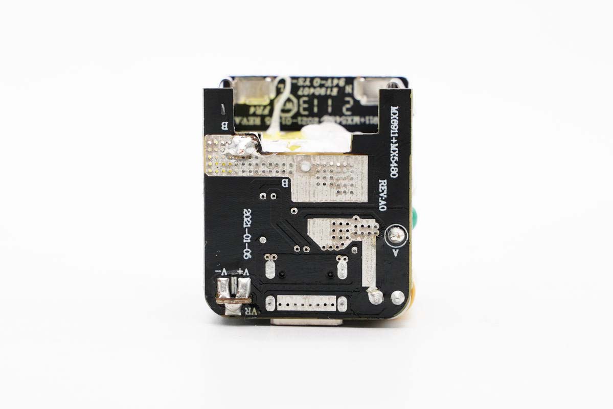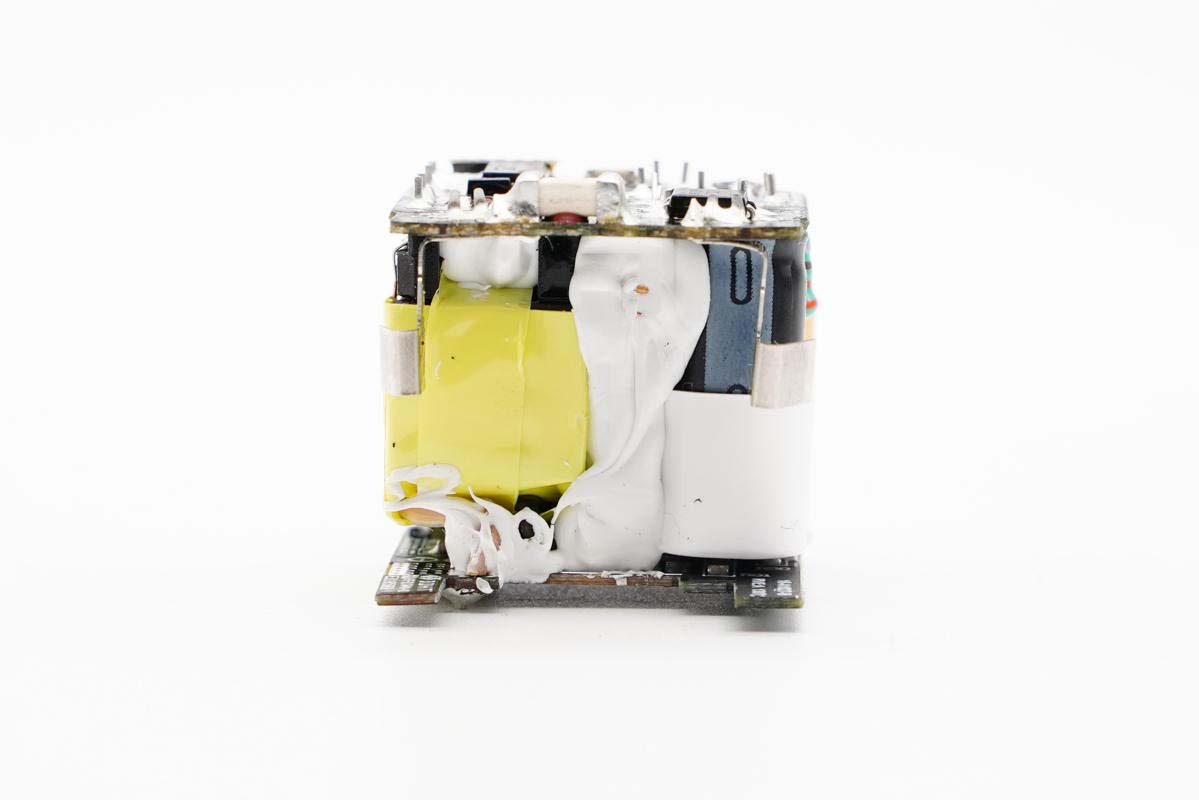充電頭網通過拆解了解到,充電器外觀雖然和自家的18W快充一樣,但此次升級20W采用了美思半導體MX6911+MX5480全新高集成超級硅快充方案,延續美思半導體一貫的簡潔外圍,在大大節省系統成本的同時讓狹小的PCB空間顯得更加寬敞,讓迷你型的堆疊設計更加易于生產,同時通過另一篇針對此產品的評測文章可以看出,其滿足超強的兼容性的同時溫升方面表現也非常優秀。此外采用了永銘和綠寶石小體積電容進行濾波。PCBA模塊打膠加固,電容做了絕緣處理,PCB板露銅加錫以及過孔增強散熱,產品整體用料扎實,做工講究。