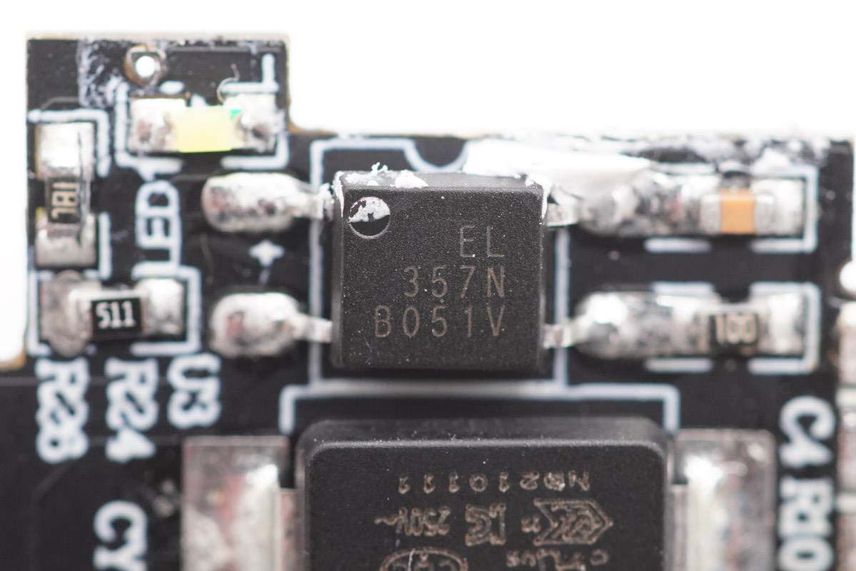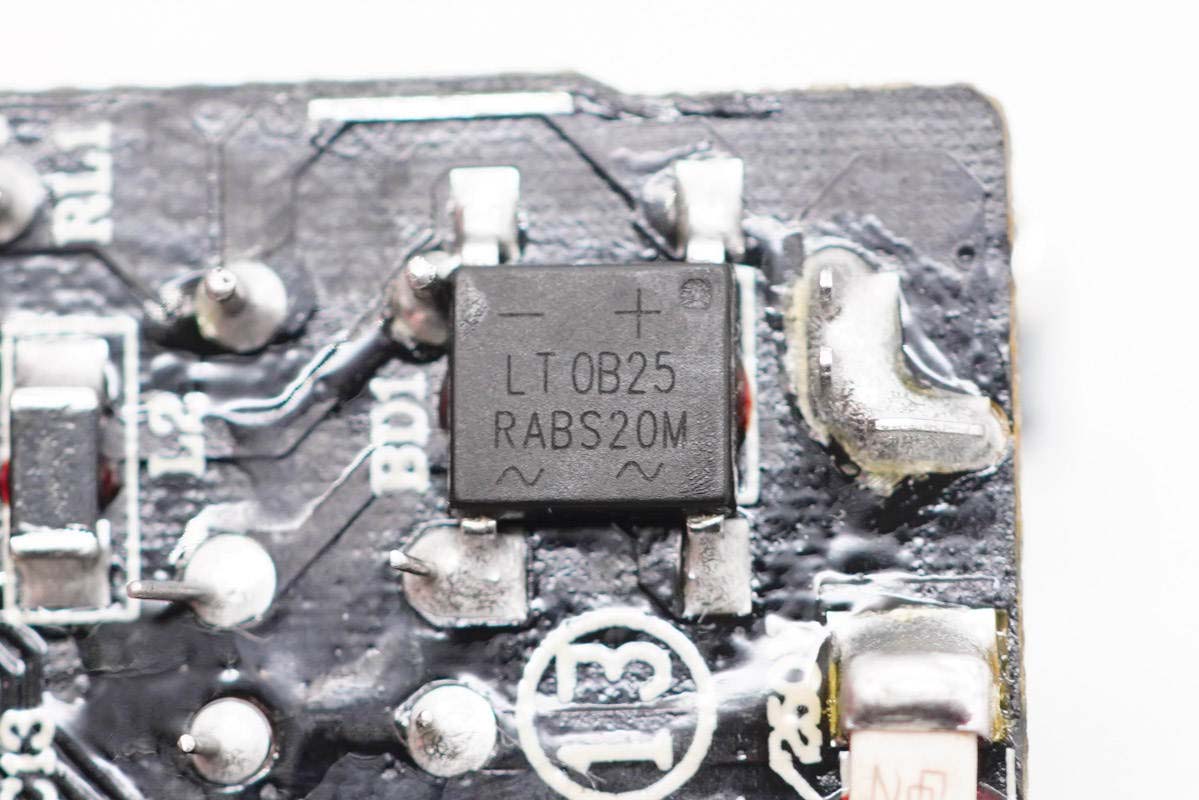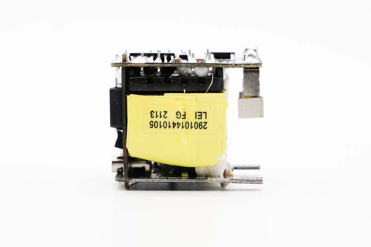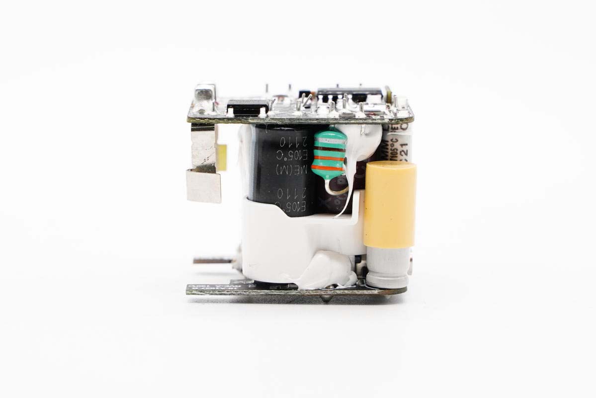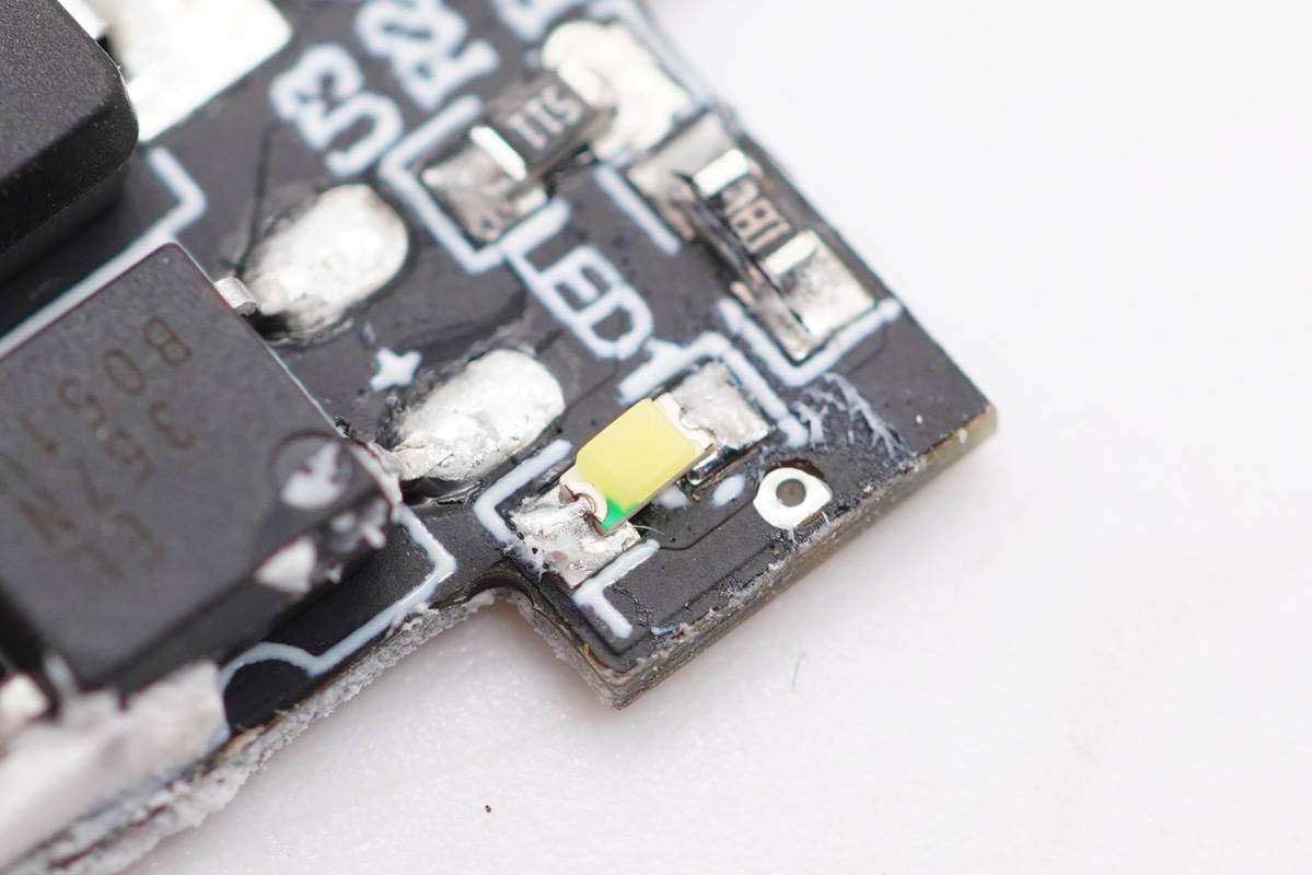 輸出端一覽,可以看到主控芯片供電電容,右側連接板上設有光耦和貼片Y電容,LED指示燈外圍泡棉防止漏光。