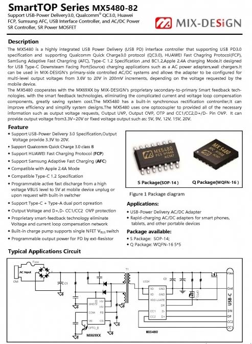 美思半導體MX5480是業界首顆集成同步整流控制器、同步整流MOS管、多協議處理三大功能的次級芯片。MX5480支持USB PD快充A+C解決方案,支持QC、PD和其它多個私有快充協議。該芯片將次級一切必要的功能All in one,用外部最少的Pin腳完成極復雜的功能。