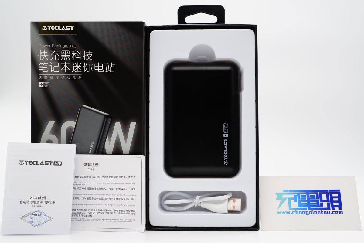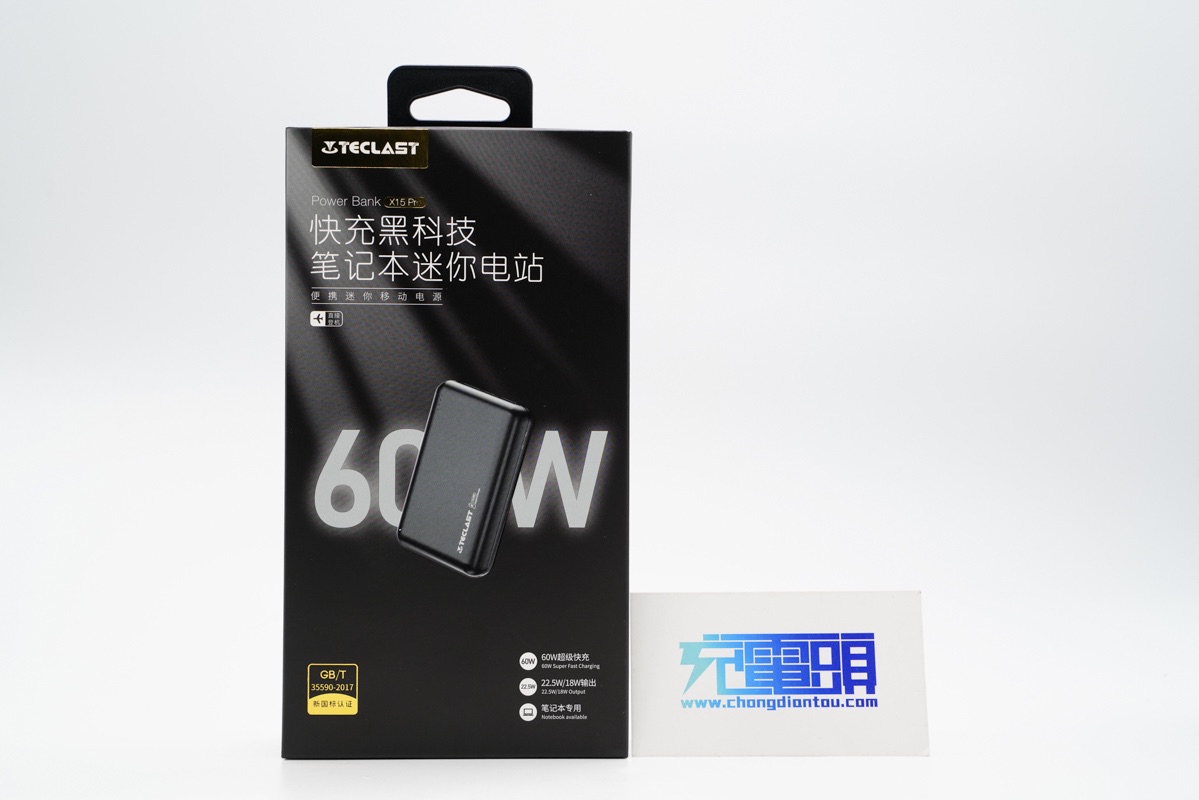這是 TECLAST 最新推出 的 60W 雙向快充充電寶,包裝盒正面就可以看出新款產品的輪廓,后面的 60W 標識也說明了這款充電寶的高性能表現。