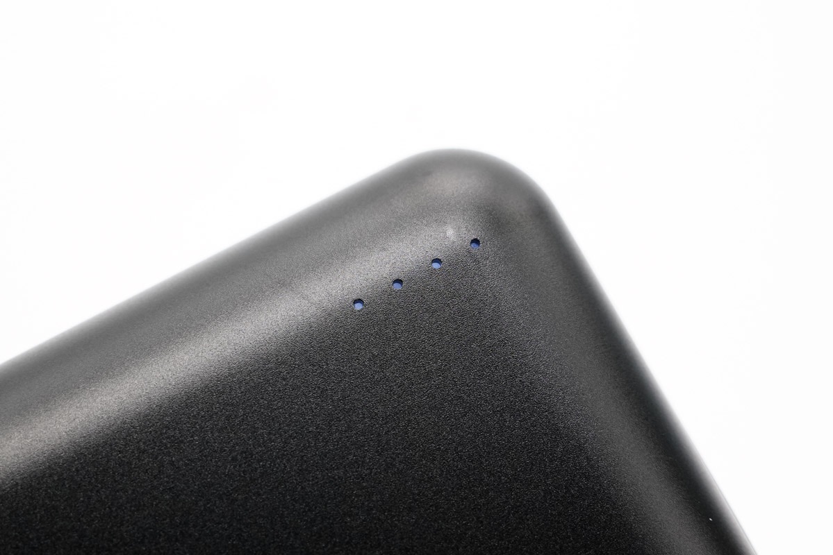 側面自帶 4 個電源指示燈,每顆指示燈代表 25% 的電量剩余,此時充電寶為滿電的狀態。