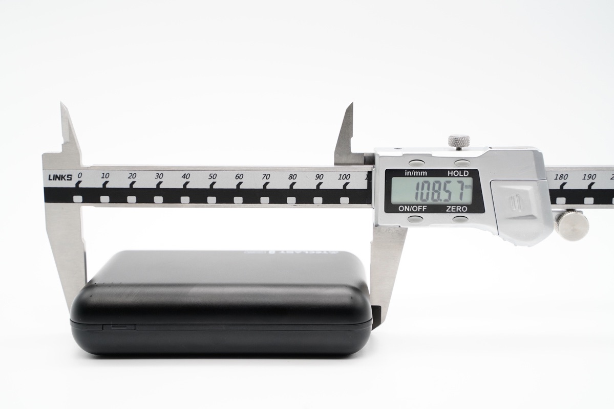 使用卡尺實測充電寶的長度約為 108.57mm。