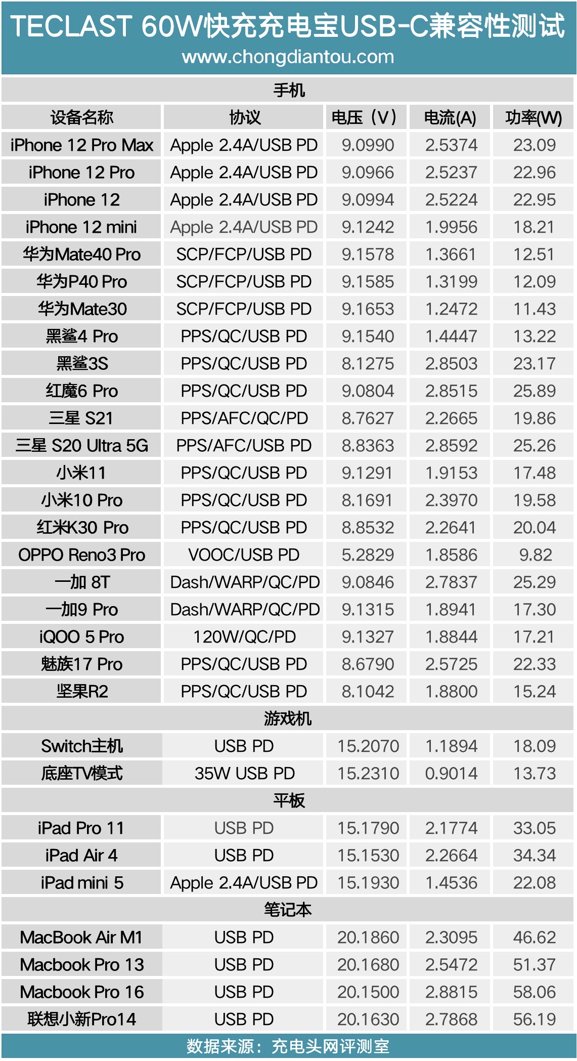 從眾多的測試數據來看,對于手機基本均可以提供 9V PD快速充電檔位,對于 Switch、iPad 以及筆電等大功率用電設備則可以提供 15V 或 20V 的高壓輸出檔位,以便可以更好的滿足設備的功率需求。