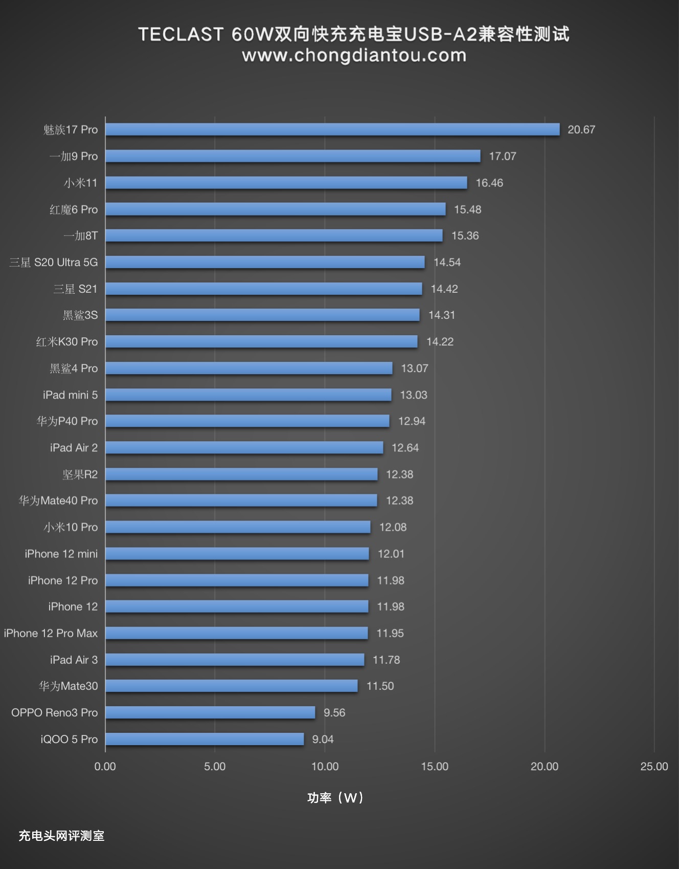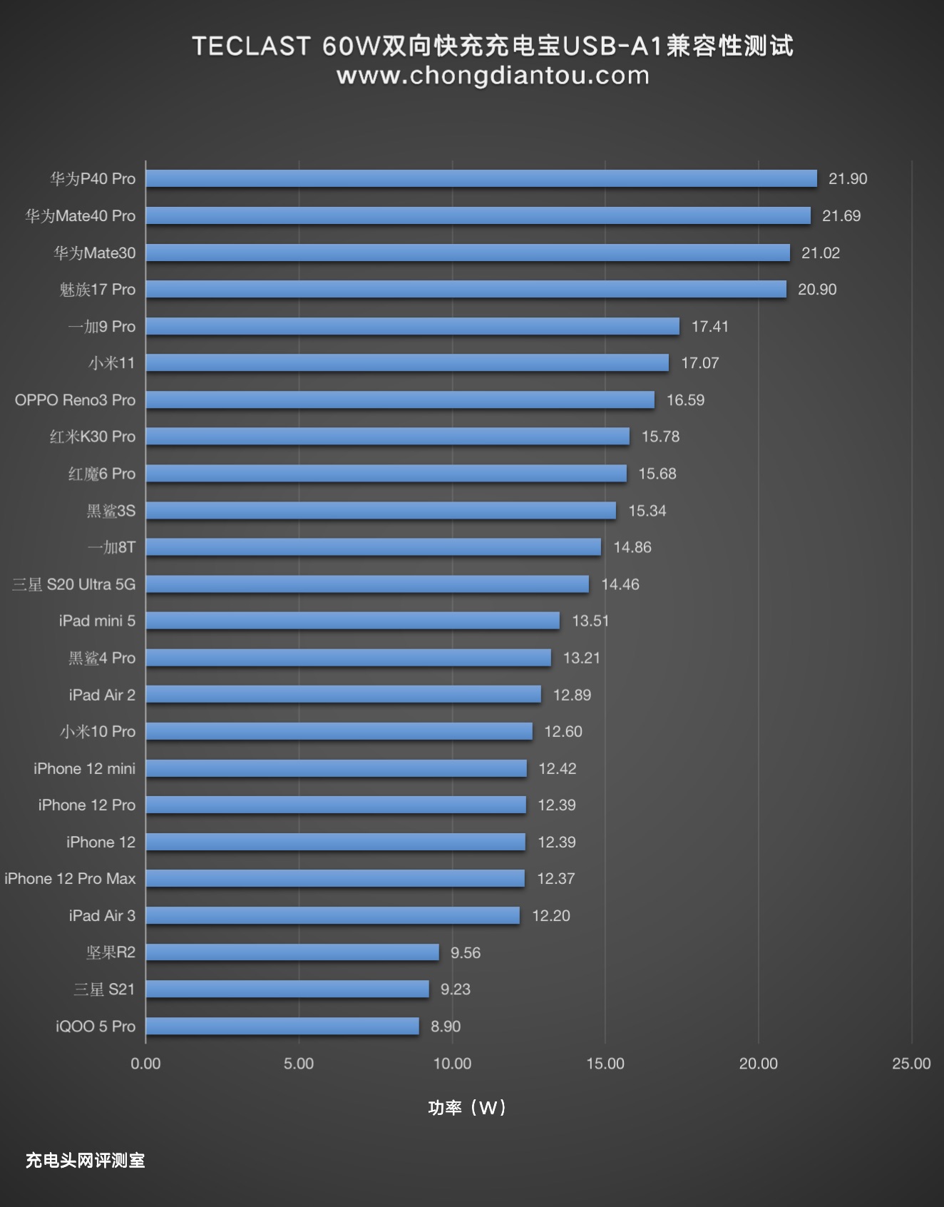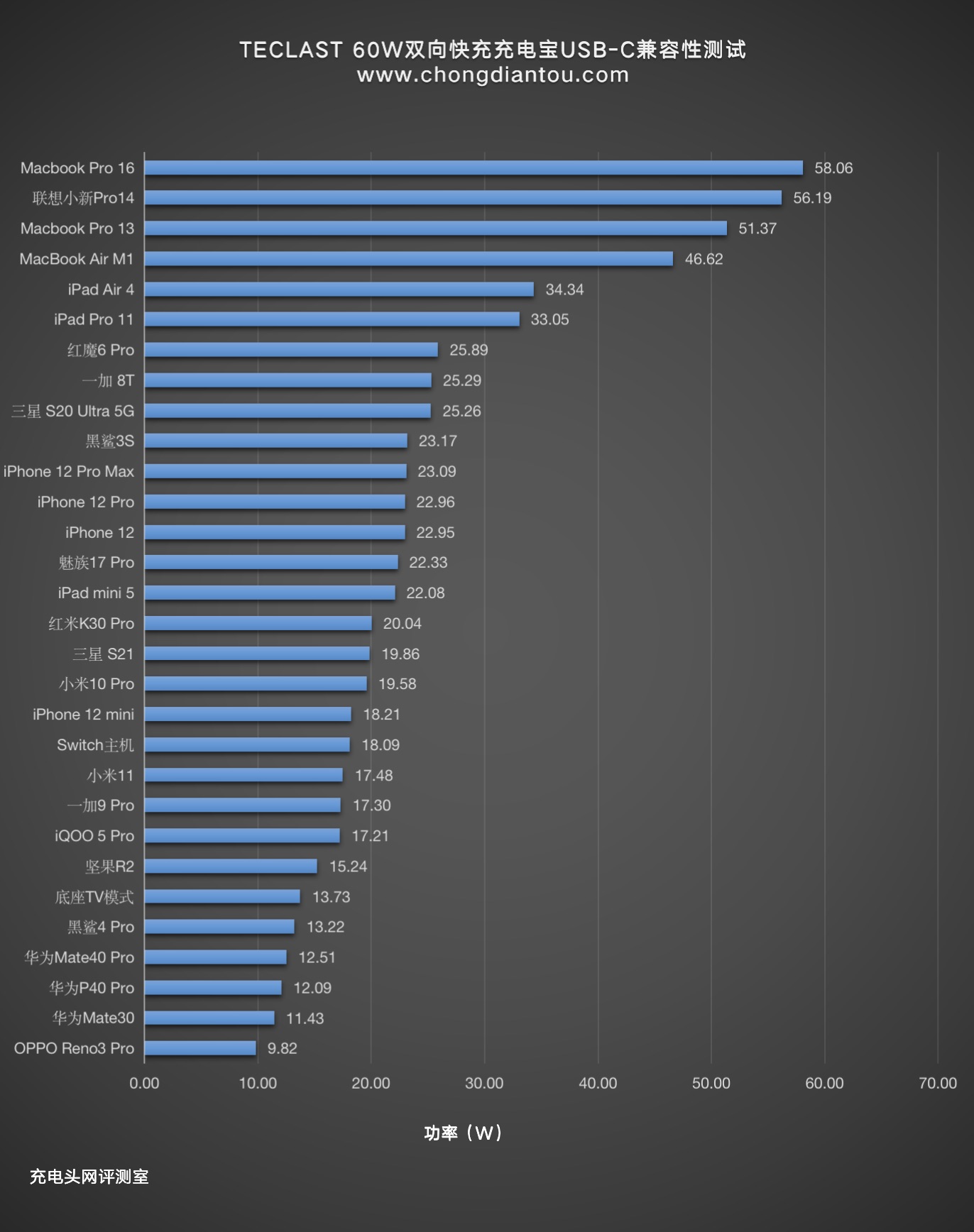 整個柱狀圖中筆電的功率自然最高,一些支持 PPS 快充的手機功率較高,在 23W-25W 不等,iPhone 手機的充電功率穩定在 18W - 23W 左右。一些排在柱狀圖后面的機型功率較低,這是因為手機自身對于 PD 快充功率的限制,導致充電寶輸出的功率較低,不過大部分還是處于快充狀態的。