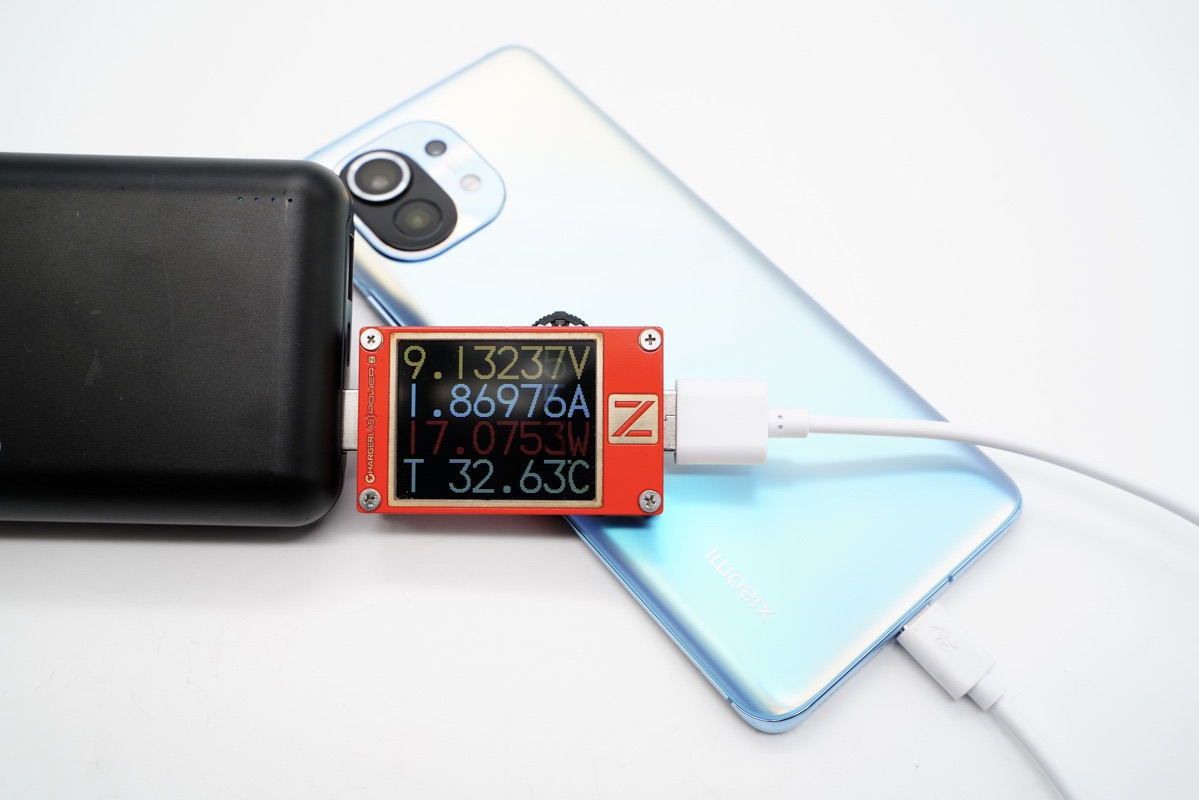 USB-A1 支持通用的 QC 快充,使用 USB-A1 為小米 11 充電,實測功率為 9.13V 1.86A 17.07W,成功觸發 QC 快充。