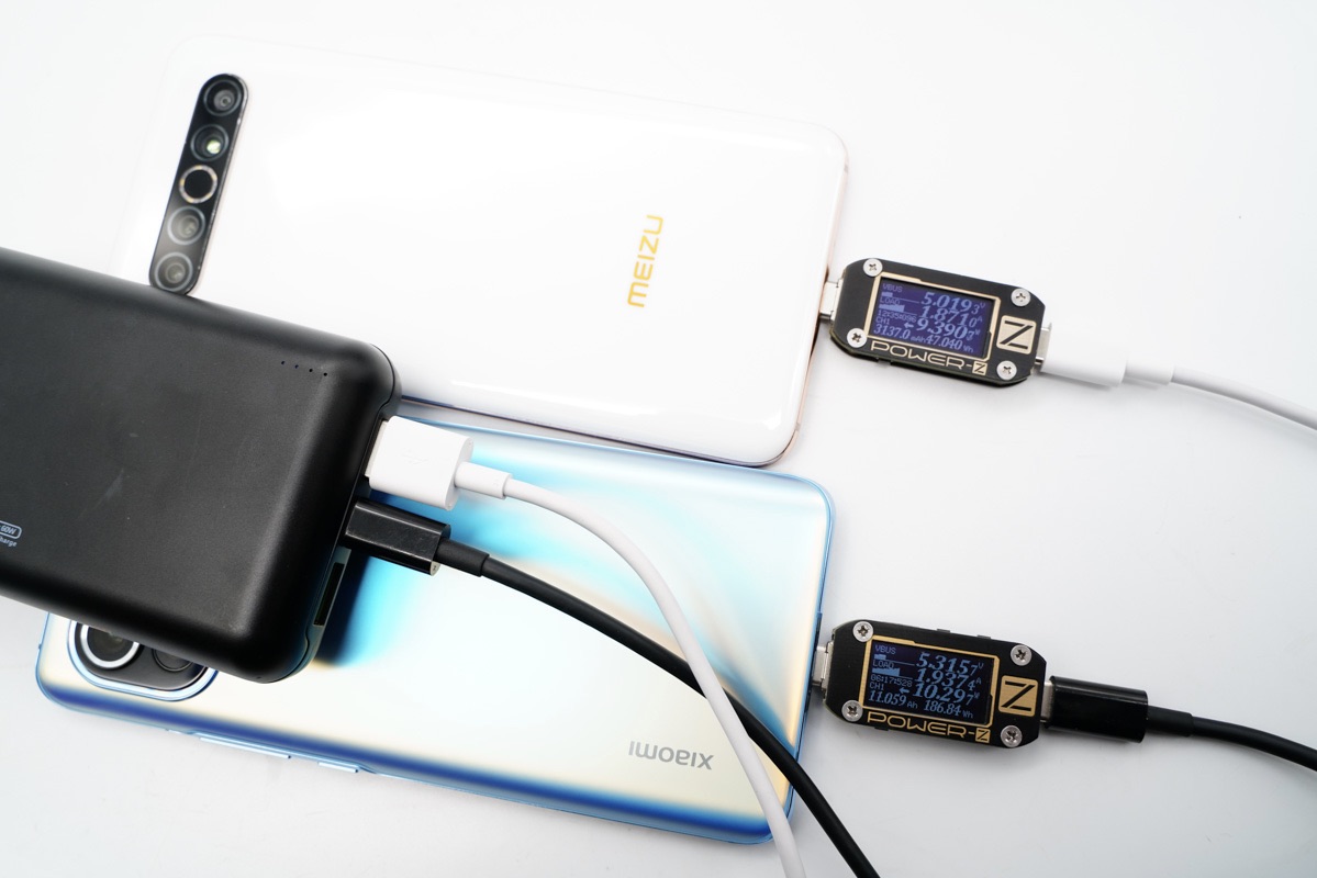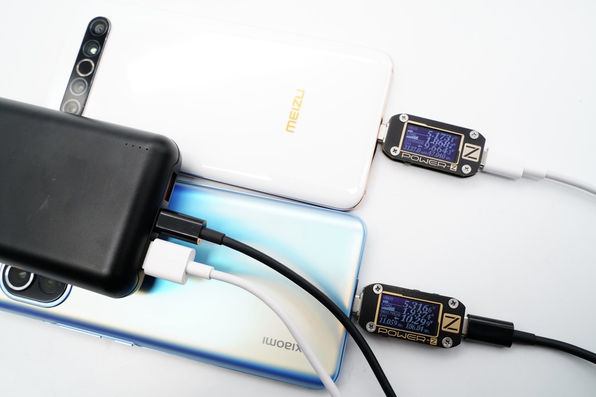 同時使用 USB-C 和 USB-A1 為兩臺手機充電,功率分別為 9.66W 和 10.29W,充電寶支持 USB-C 和 USB-A1 同時輸出且共享 5V3A 輸出。