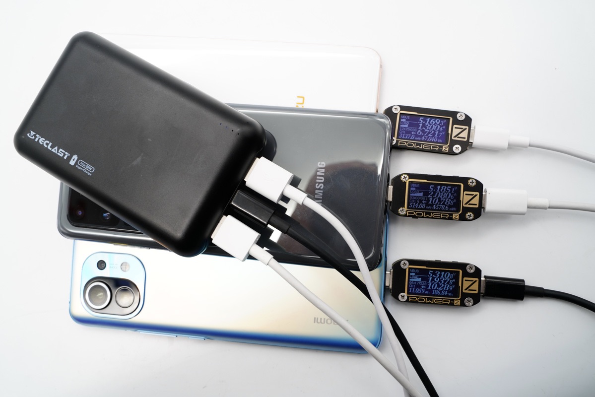 最后同時使用 3 個 USB 接口為 3 臺手機充電,功率分別為 6.72W、10.78W 和 10.28W,充電寶支持 3 個 USB 接口同時輸出,總輸出功率在 27W 左右。