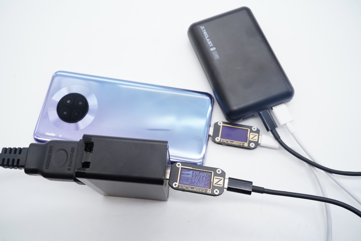 通過 USB-C 為充電寶自充電,同時使用 USB-A 為手機充電,實測充電寶不支持邊充邊放。