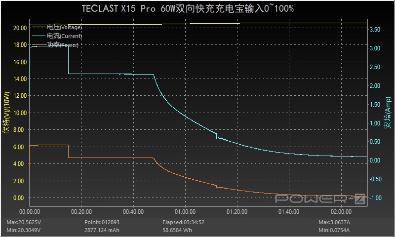 使用蘋果 96W 充電器為充電寶充電,約 15 分前功率在 62W 左右。到 47分 前功率在 47W 左右,隨后功率和電流逐漸下降直至充電結束,全程耗時約 2 小時 06 分,最高功率為 20.30V 3.06A 62.19W。