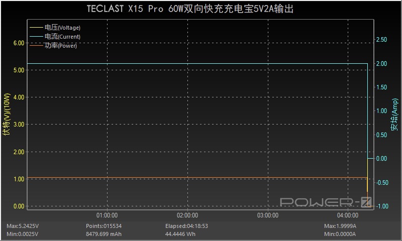 首先以 5V2A 檔位對充電寶進行輸出效率測試,整個測試過程中電壓、電流和功率平臺均非常穩定。全程耗時約 4 小時 14 分。放出的能量約為 44.4446 Wh,所以充電寶在以 5V2A 檔位輸出時效率約為 44.4446/50=88.89% 。