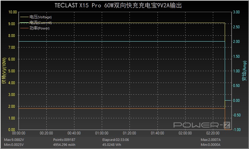 將電壓提升至 9V,以 9V2A 檔位對充電寶進行輸出效率測試,整個測試過程表現和 5V2A 相同,全程耗時約 2 小時 28 分。放出的能量約為 45.0248 Wh,所以充電寶在以 9V2A 檔位輸出時效率約為 45.0248/50=90.04% 。
