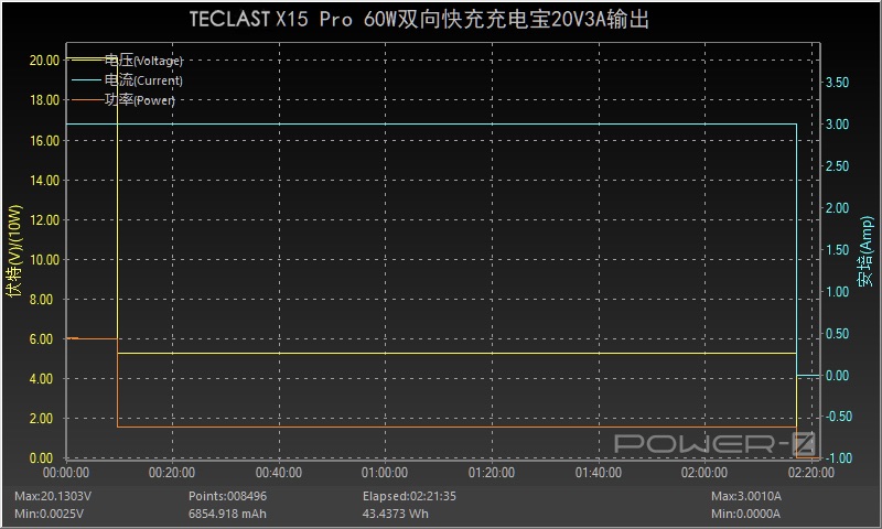 最后以 20V3A 檔位對充電寶進行輸出效率測試,實際發現在測試進行到約 10 分鐘的時候電壓電流降至 5V3A 輸出,最終持續到 2 小時 17 分結束。