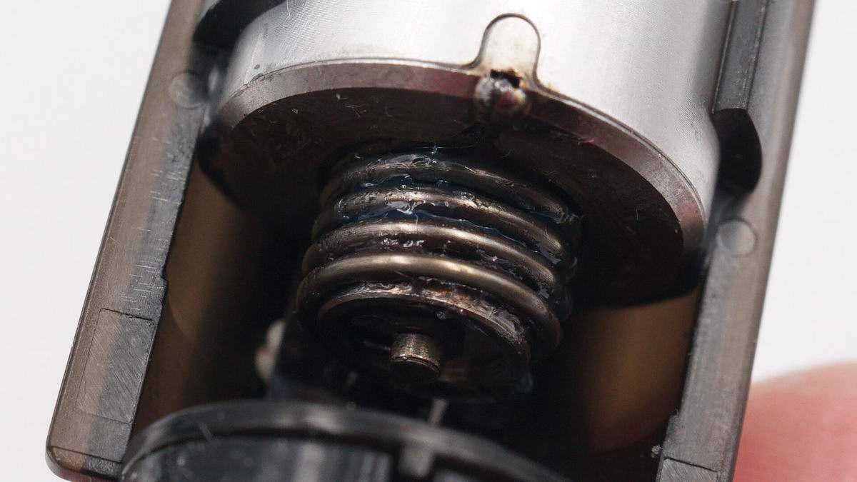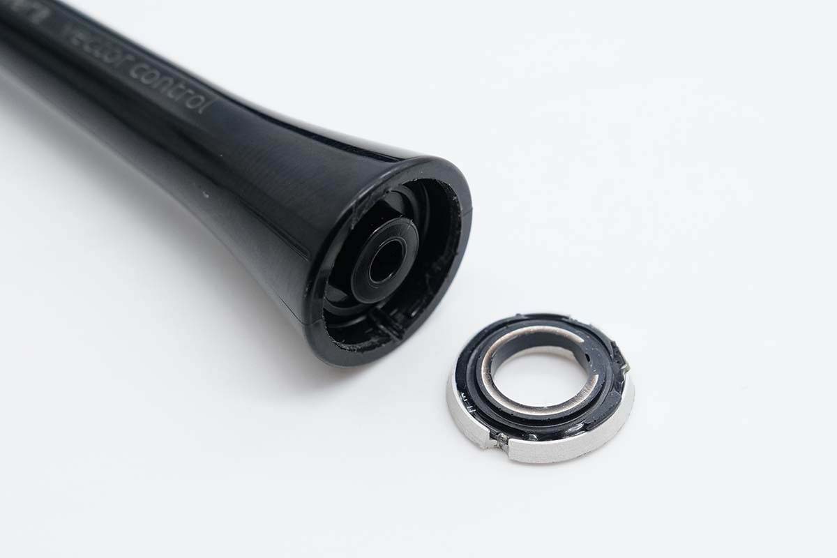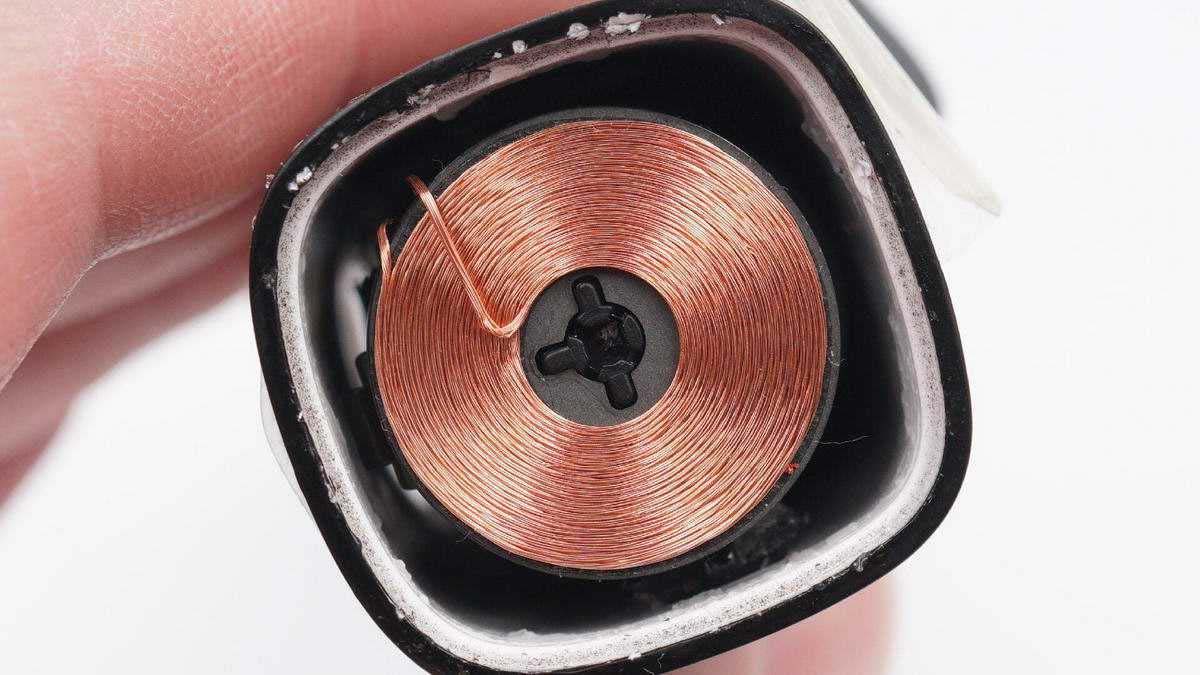 拆下刷頭封膠固定的底部金屬壓環,可以看見緊貼壓環部分有一圈感應線圈。
