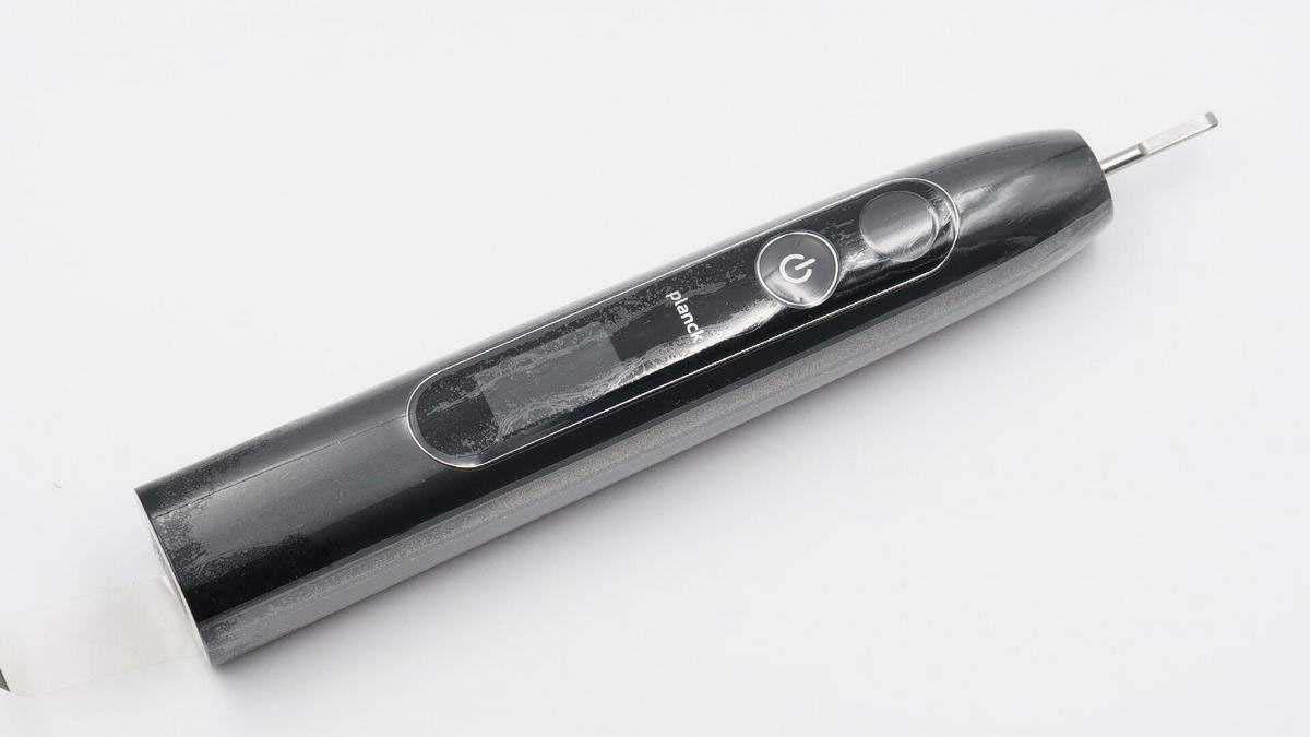 牙刷手柄包裹防刮塑料膜,頭部設有刷頭軸。機身上功能按鍵(模式/力度)、電源按鍵以及顯示屏。顯示屏上可以顯示覆蓋率、時長、壓力、剩余電量等。