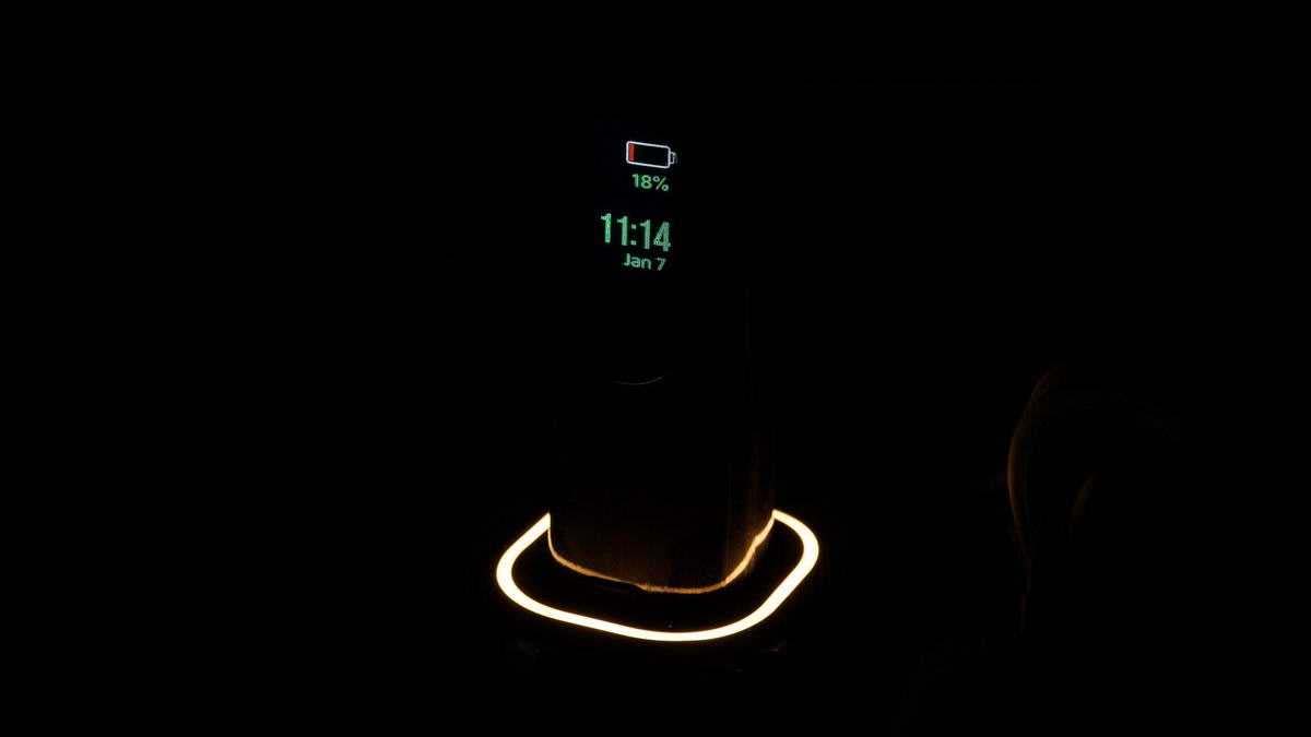 夜間場景下,無線充底座燈帶亮淡黃色氛圍光,氛圍燈是可以通過牙刷用手機APP進行控制,作為小夜燈使用,充電時候牙刷手柄的顯示屏顯示日期和電量情況。