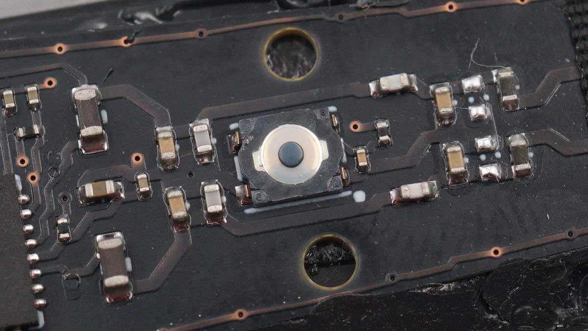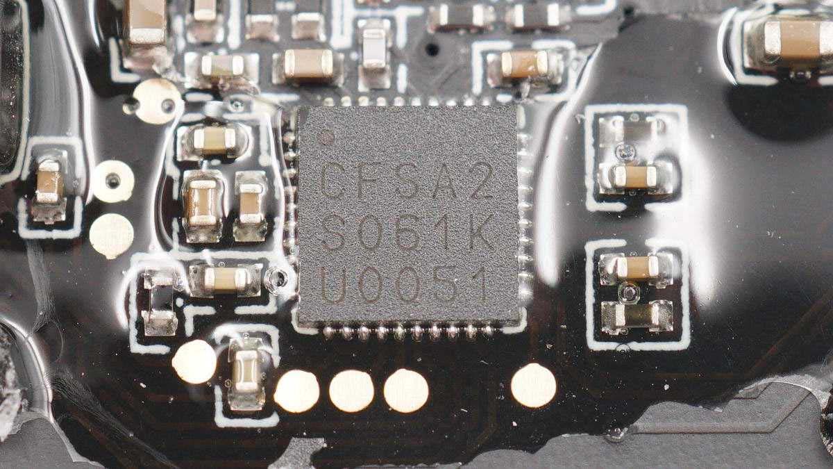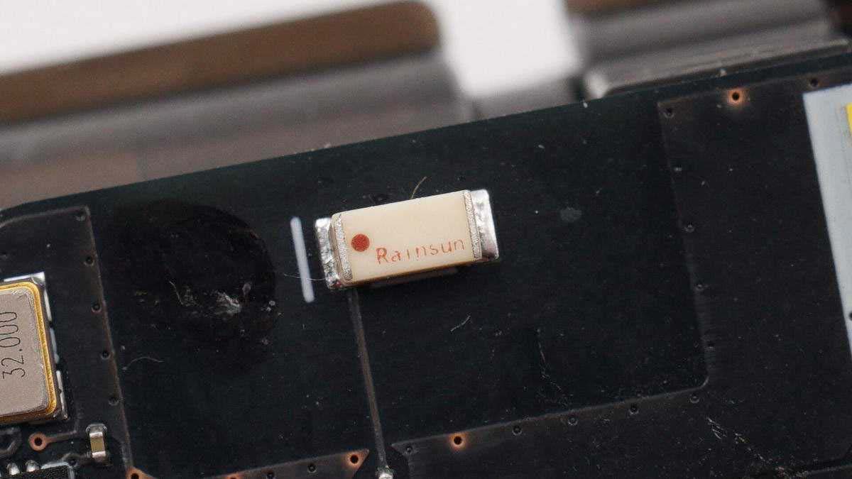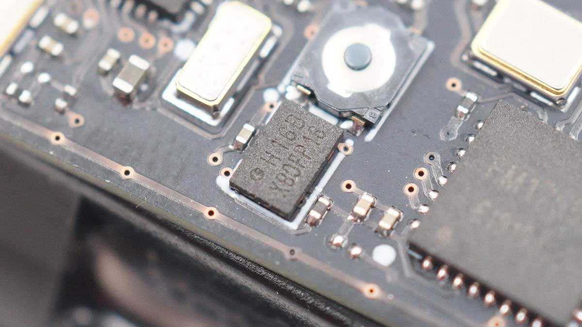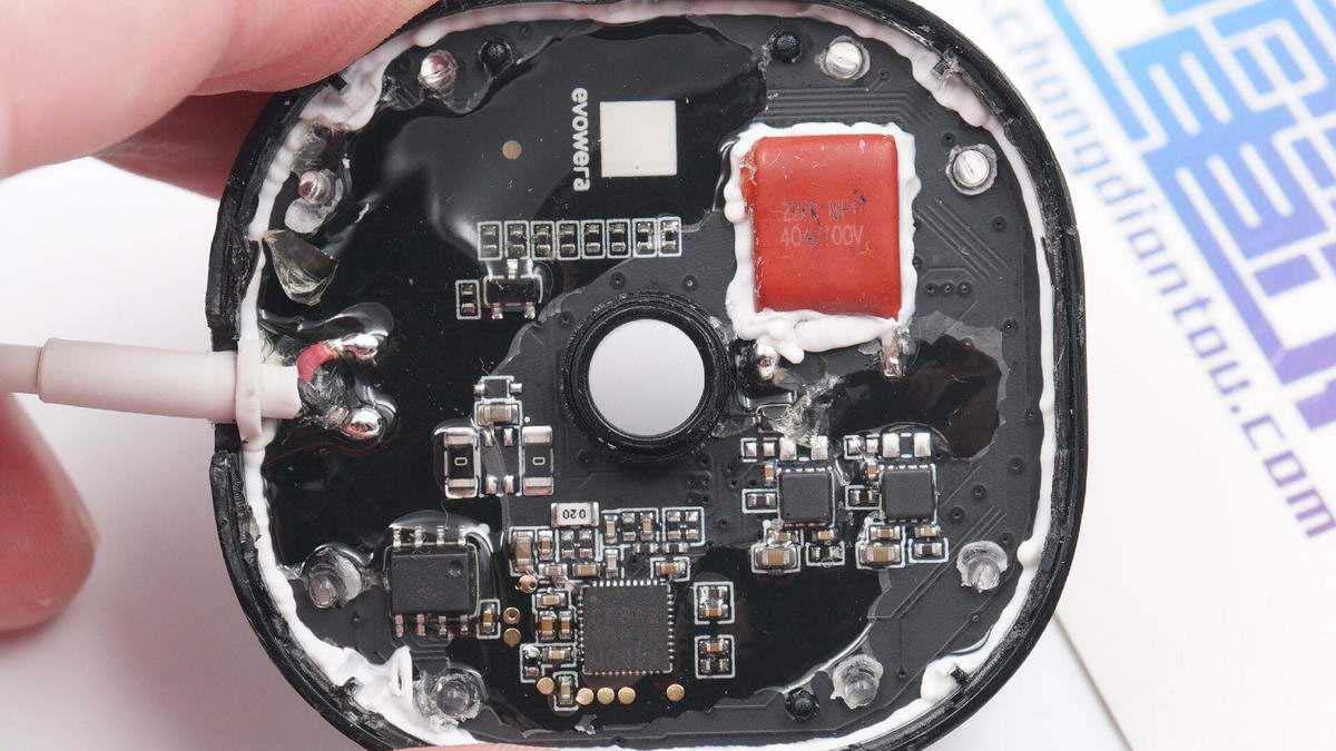 將防水膠清理掉,可以看到有存儲芯片、無線充主控芯片、兩顆MOS管以及諧振電容,電容打膠固定。板子另一面有無線充電線圈,不過為了極致防水,內部使用硬封膠填充成一個整體,板子沒法拆下來。