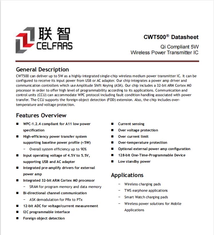無線充電SOC主控芯片采用江西聯智的CWT500,是一顆可提供高達5W功率的高集成單芯片無線充電發射IC。支持USB和適配器輸入;還集成了MOS管驅動器,兼容QI協議使用ASK和FSK的通信控制器。
