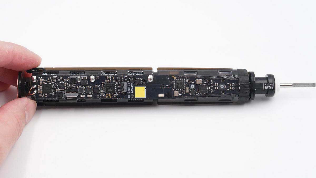 牙刷手柄拆開,無線充接收器采用了江西聯智CWR500單芯片解決方案,采用恩智浦QN9080藍牙主控連接協調整個牙刷的各個功能模塊,MPS MP2322降壓為主控和屏幕供電,矽力杰SY6984升壓為牙刷內部二串電池充電,IESC1000芯片用于永磁同步伺服電機驅動控制,電機涂機油防銹,MPU6500用于運動追蹤。整個手柄的電路設計相當復雜,也側面體現了產品的可靠性,整體用料做工很好。