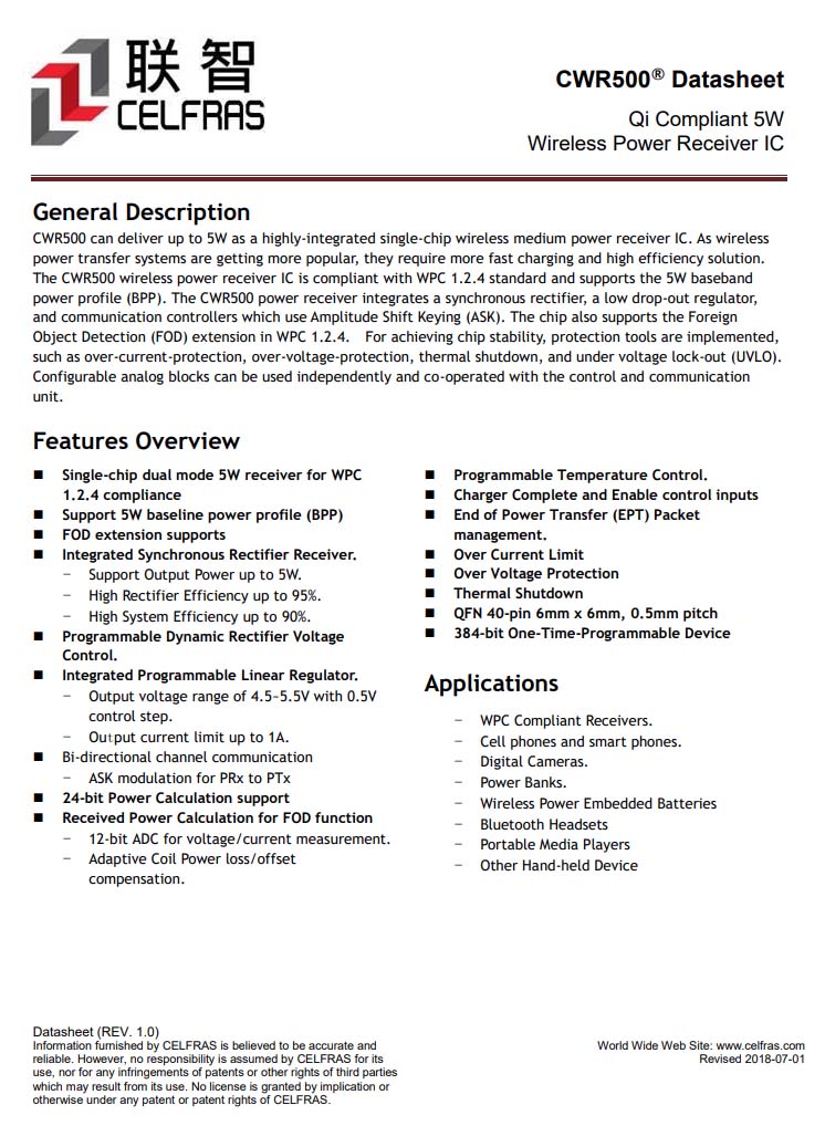 無線充接收器也是來自江西聯智,型號CWR500。用于無線充電接收,內置整流管,電路集成度高,固定5V輸出。