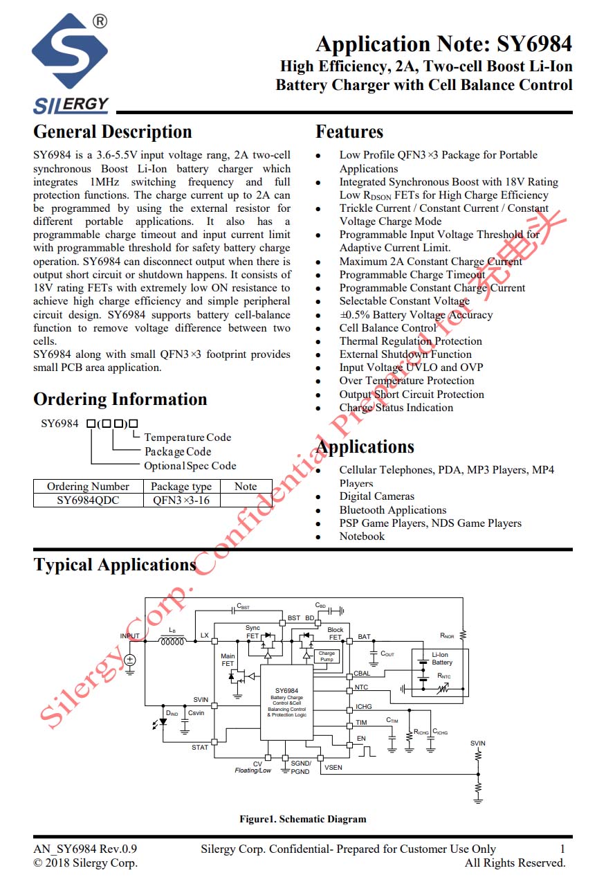 矽力杰 SY6984,高效率二串升壓電池充電器,支持電池均衡控制,最大充電電流2A。將無線充電接收輸出的5V為牙刷內部二串電池組充電。