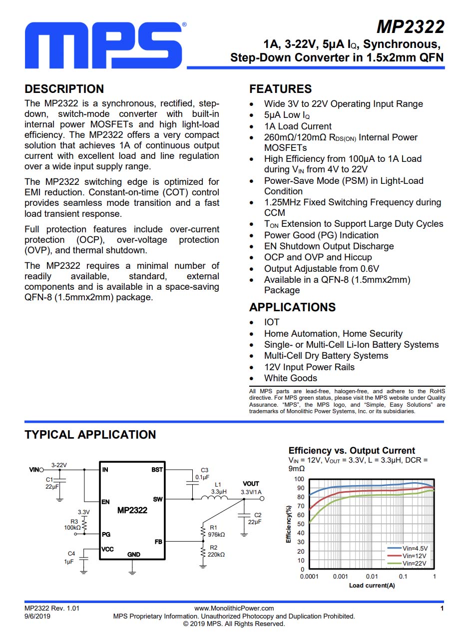 MPS MP2322,5μA超低靜態電流的同步整流降壓轉換器,輸入電壓范圍3-22V,最大輸出電流1A,為主板上的控制器及屏幕供電。