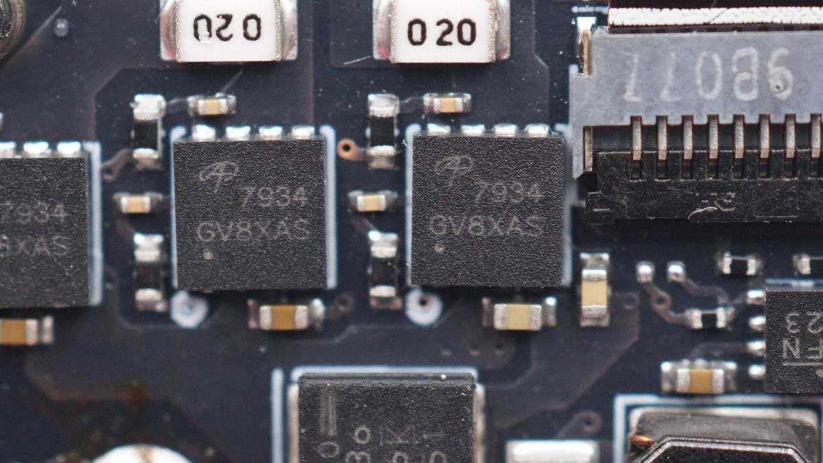三顆AOSMD AON7934非對稱雙NMOS,耐壓30V,用于永磁同步伺服電機驅動。