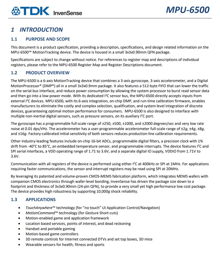 TDK MPU6500 3軸加速度及3軸角度傳感器,內置數字運動處理器,用于運動追蹤功能。