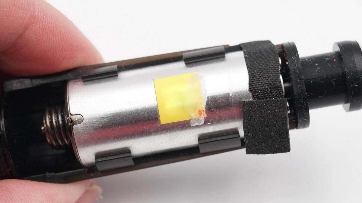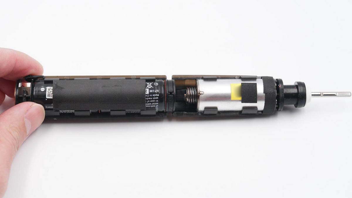 將電池組拿掉,底部壓有一根連接排線,用來連接永磁同步伺服電機與背面的牙刷主板。