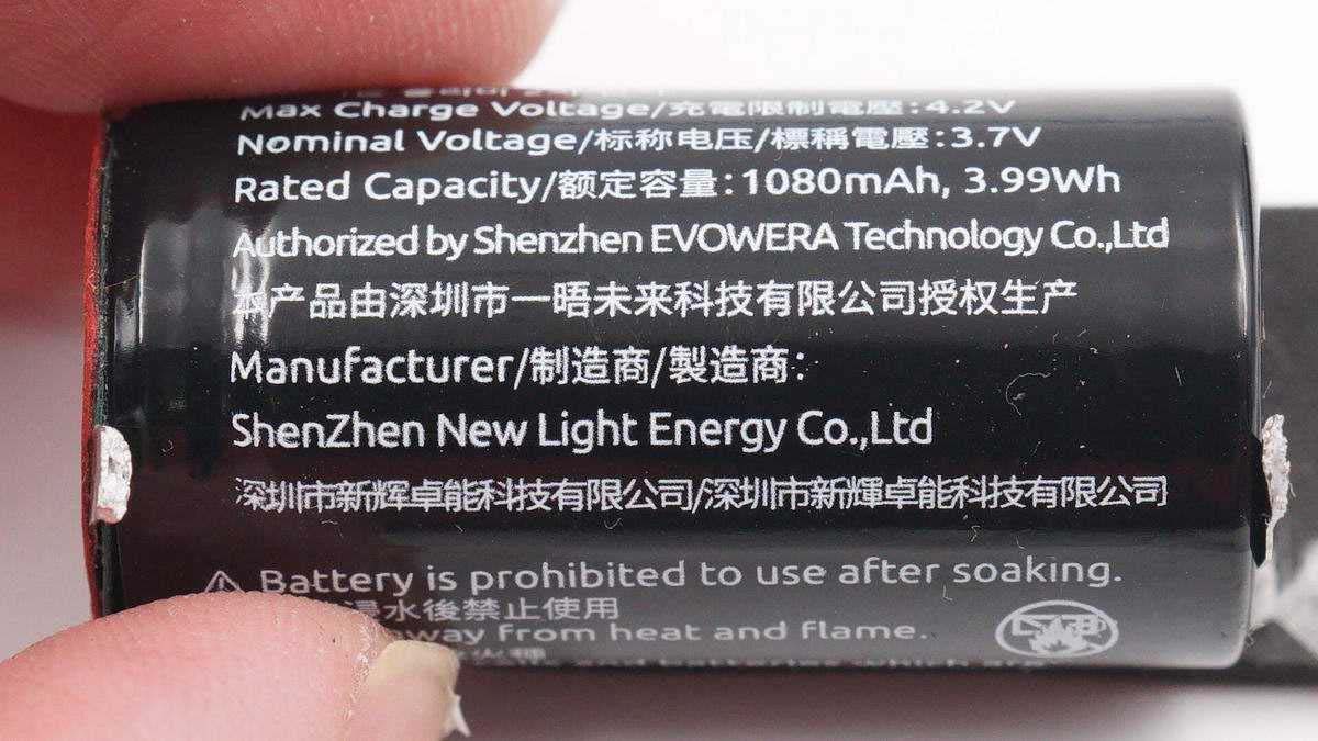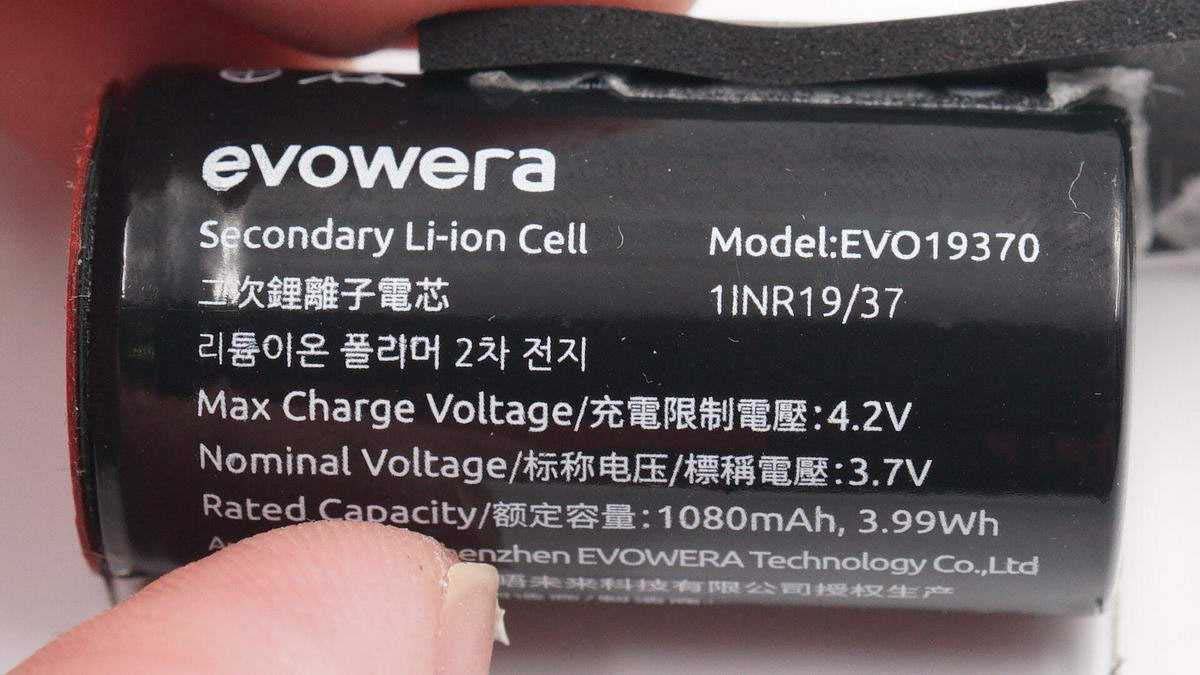 二次鋰離子電芯特寫,型號EVO19370,規格為1080mAh/3.99Wh/3.7V,充電限制電壓4.2V。
