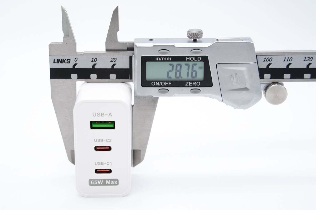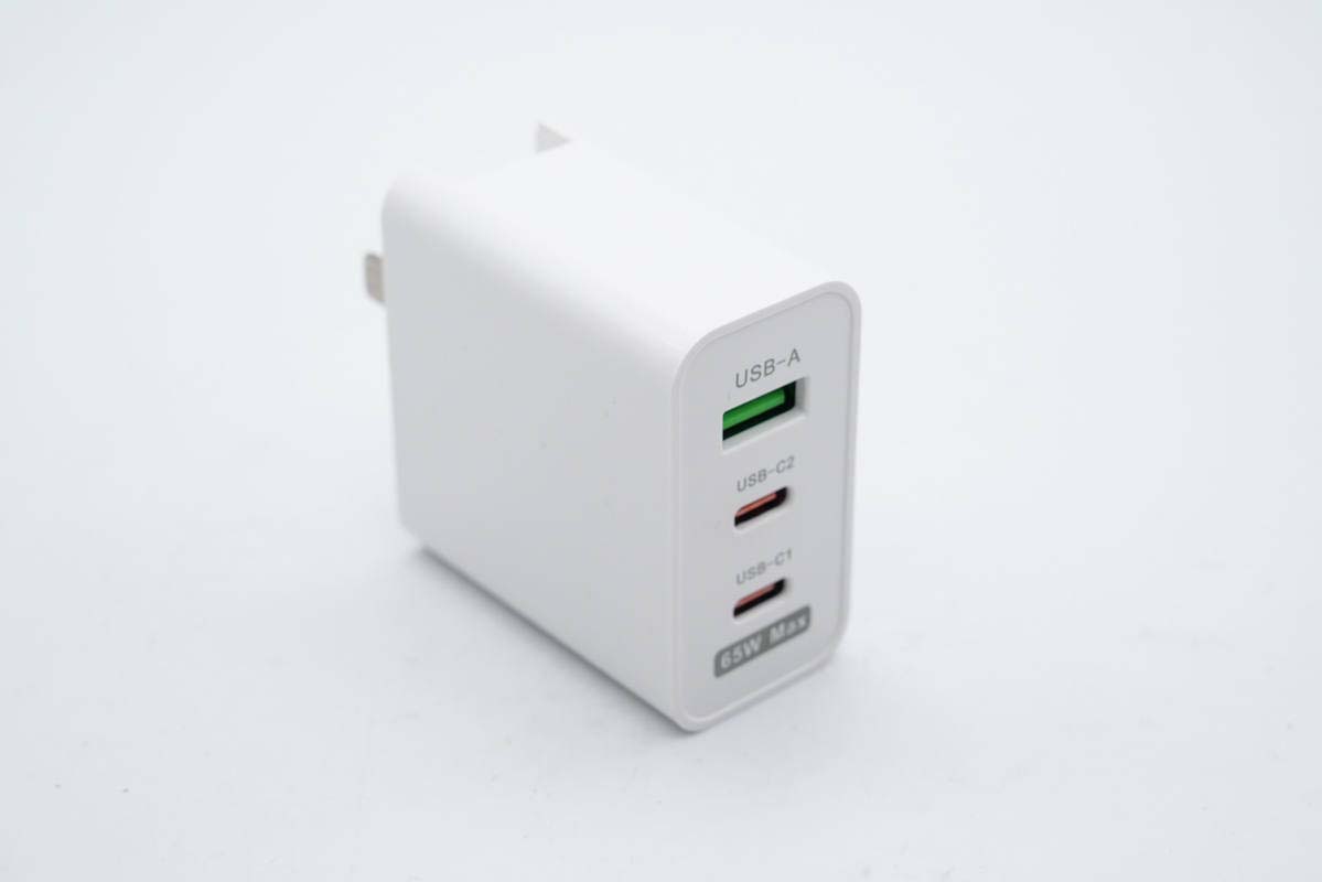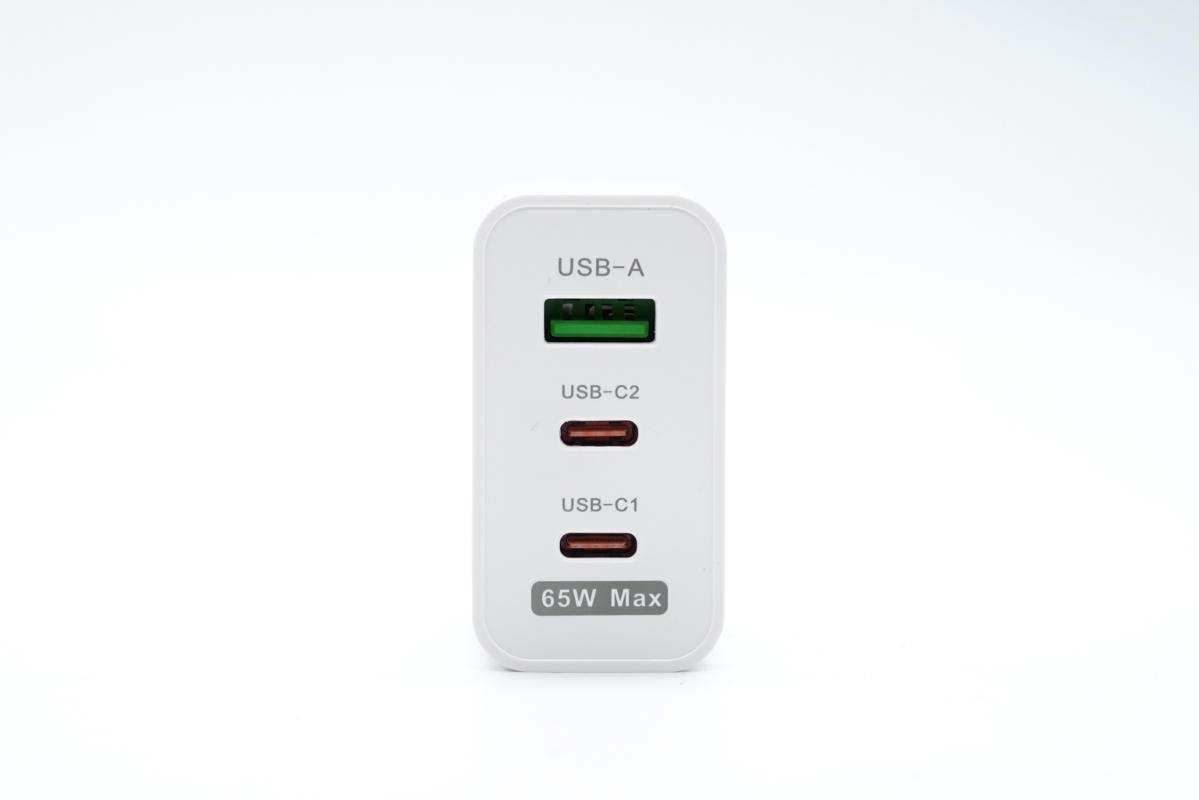 輸出端配備2C1A三個接口,A口綠色膠芯,兩個C口為紅色膠芯,接口旁都印有區別標識,此外還有“65W Max”最大輸出功率標識。