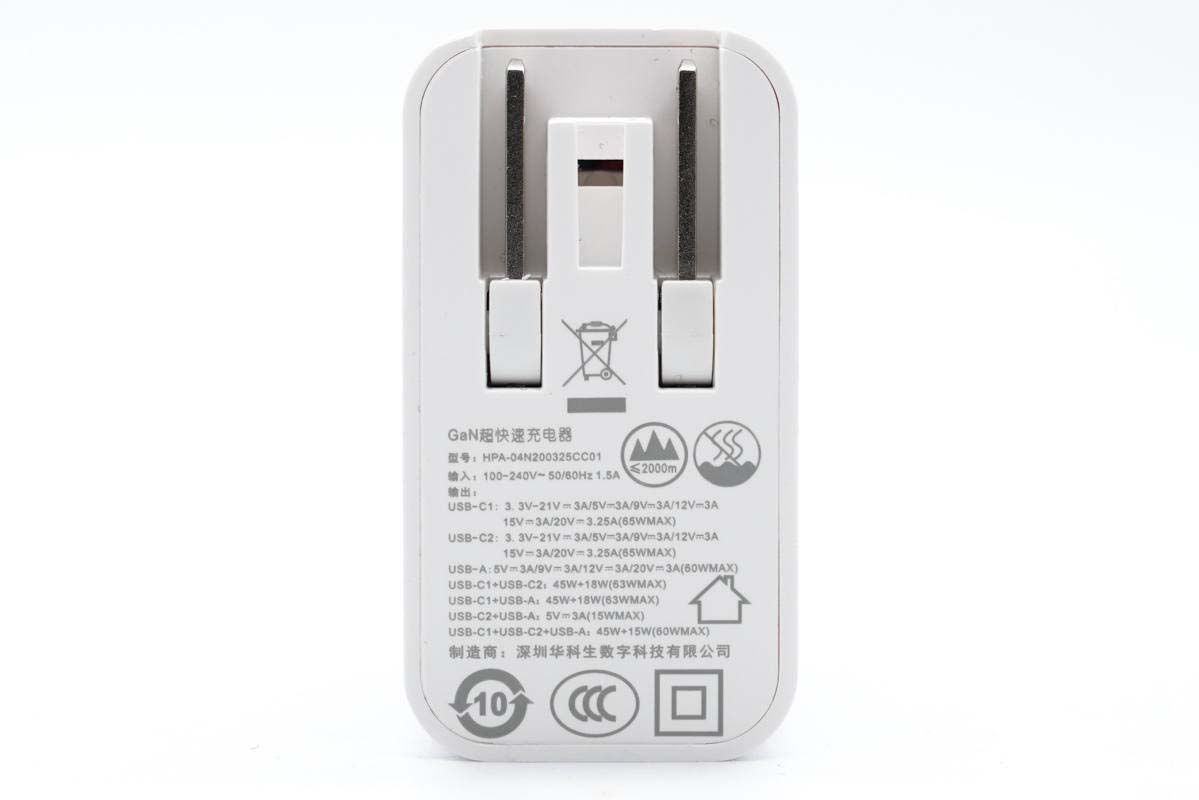 華科生65W氮化鎵快充采用PC阻燃材質白色外殼,腰身高光亮面處理,各面間過渡圓潤,十分光滑簡潔,使用手感好。