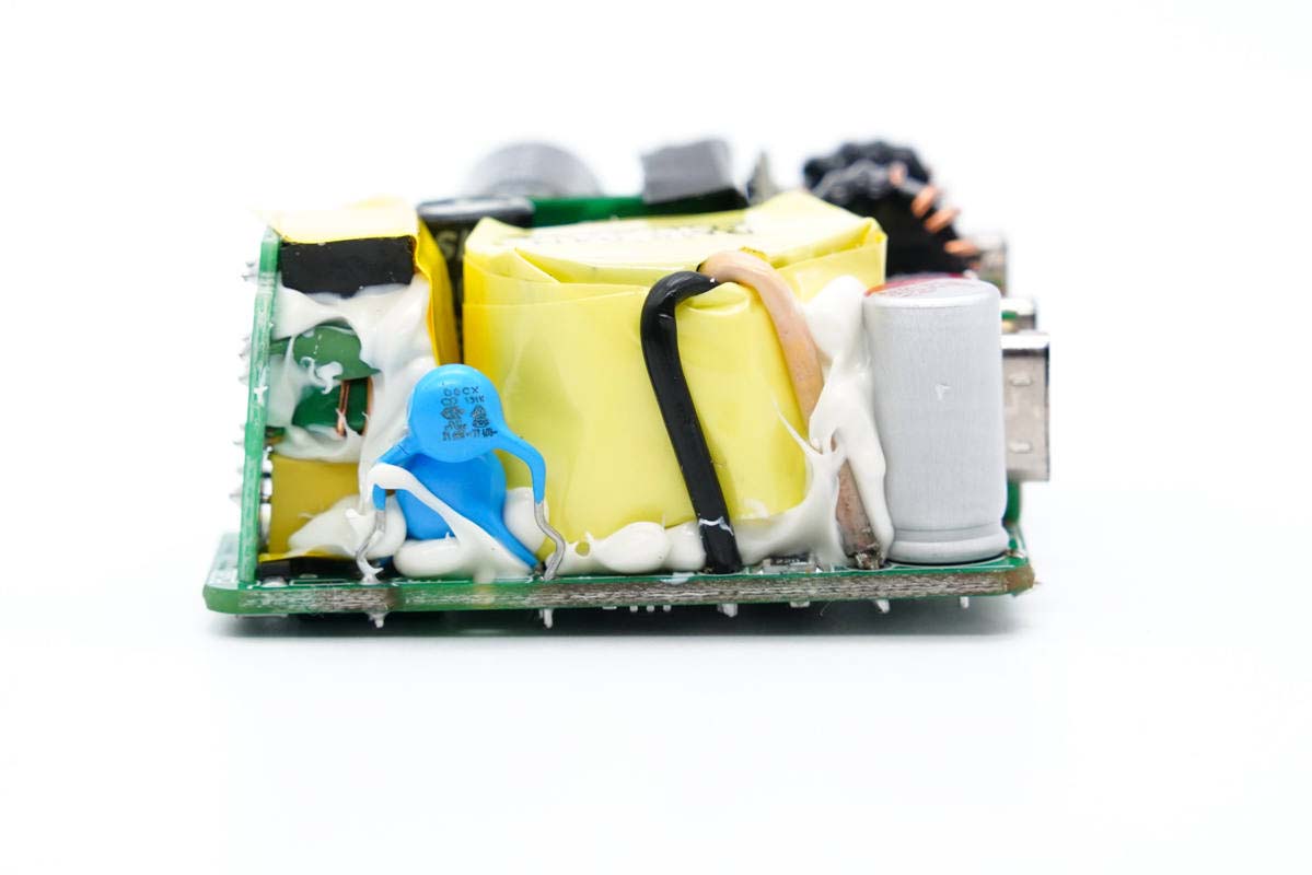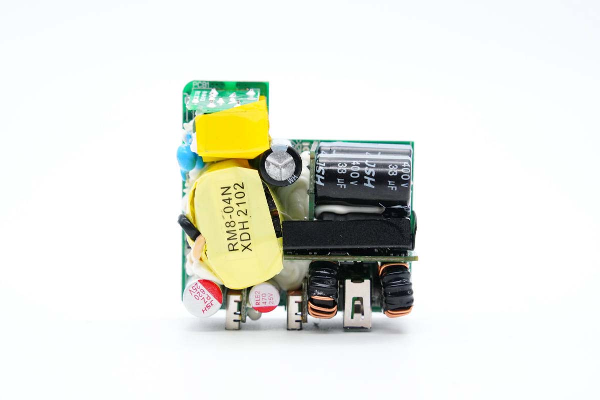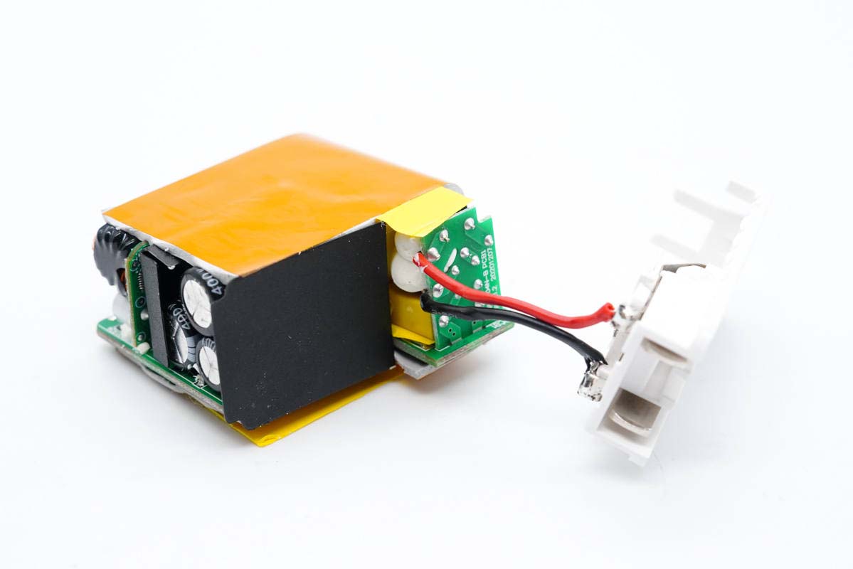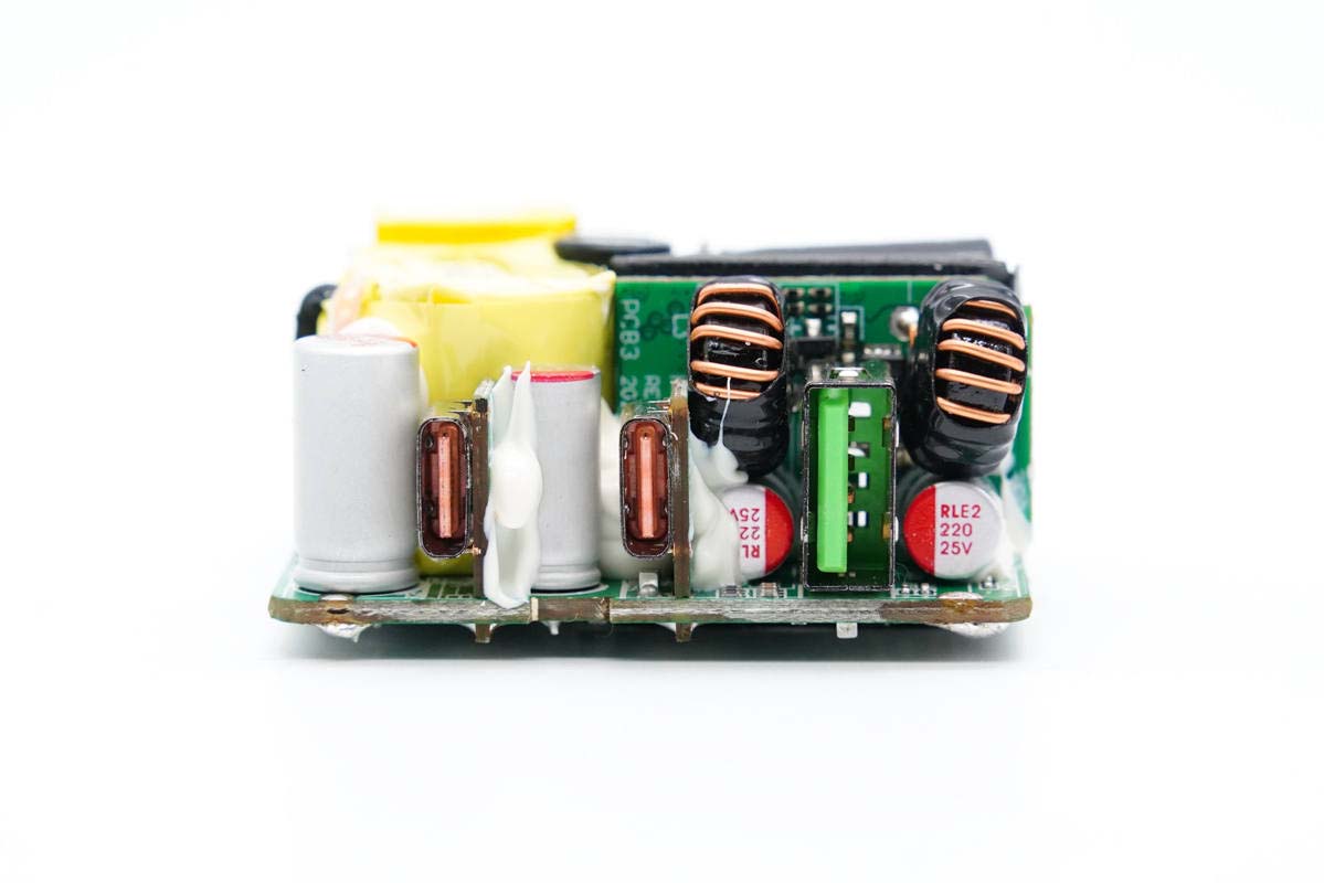 PCB板正面一覽,高壓濾波電解電容、USB-C母座均焊接在小板上,此外次級側還有一塊二次降壓小板,初級次級之間有隔離板進行絕緣隔離。