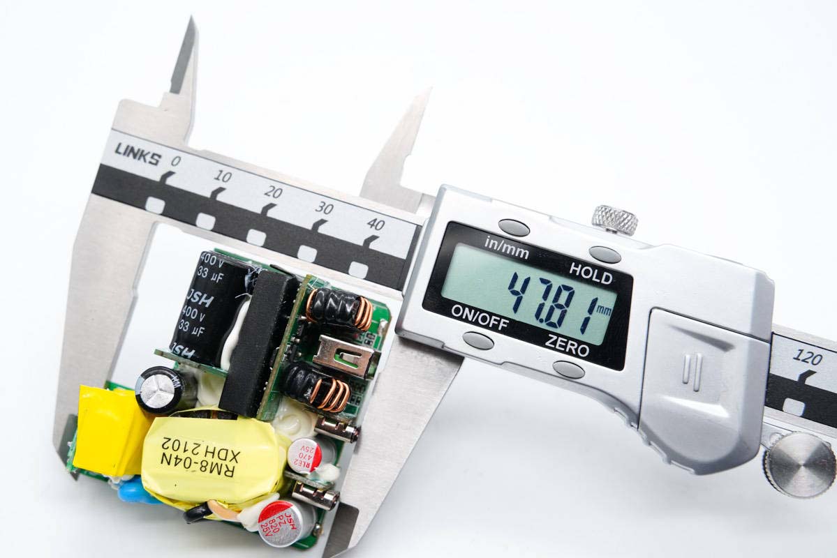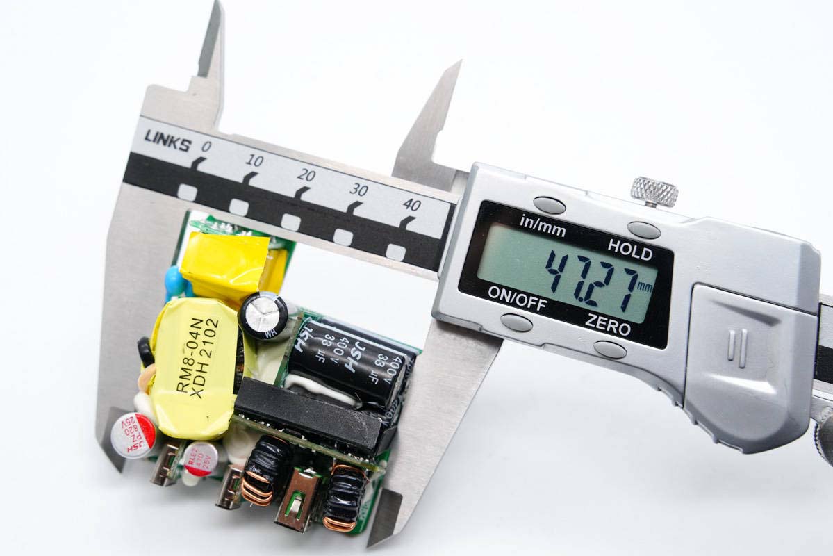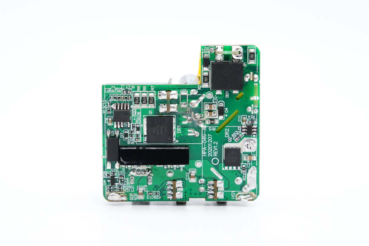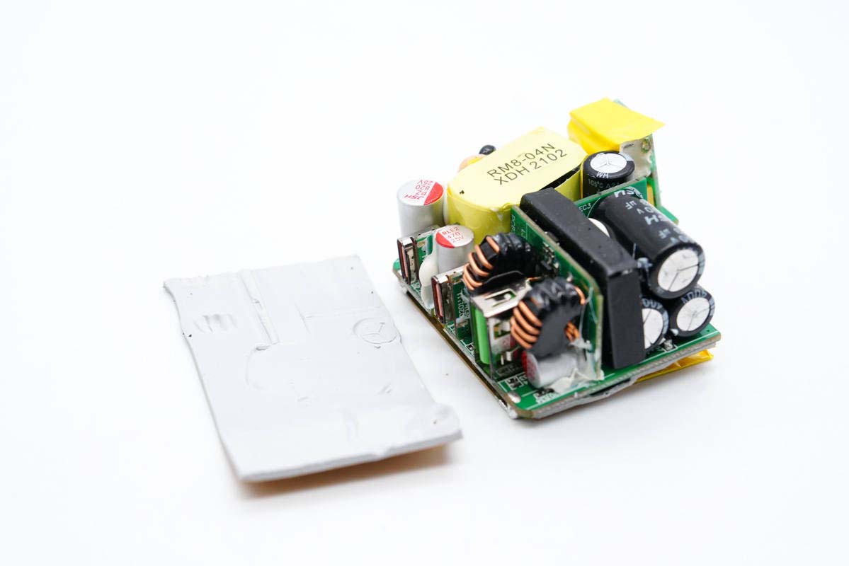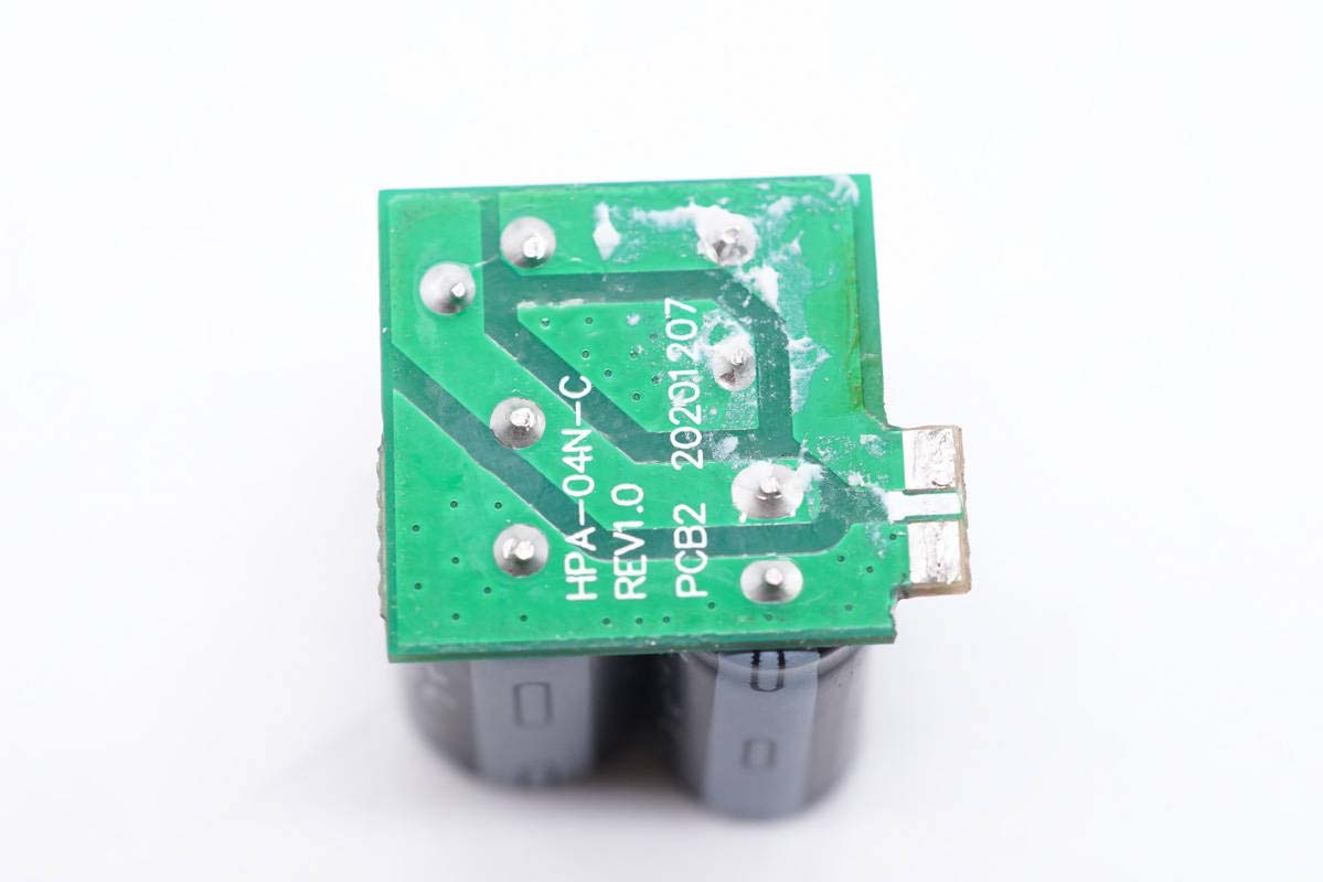 PCB板正面一覽,高壓濾波電解電容、USB-C母座均焊接在小板上,此外次級側還有一塊二次降壓小板,初級次級之間有隔離板進行絕緣隔離。