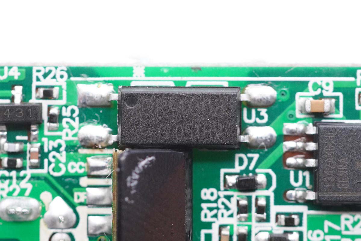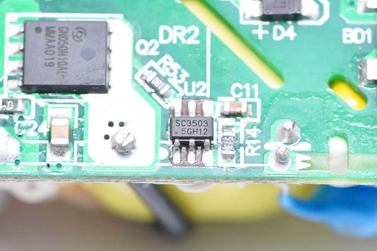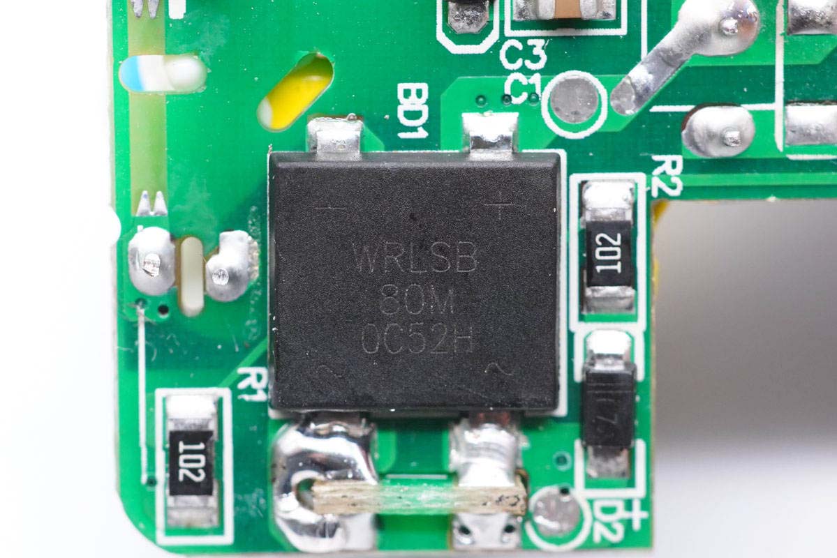 PCB板背面一覽,右上角是一顆整流橋,此外是初次級控制器搭配對應MOS管組成的開關電源電路,外圍很簡潔。
