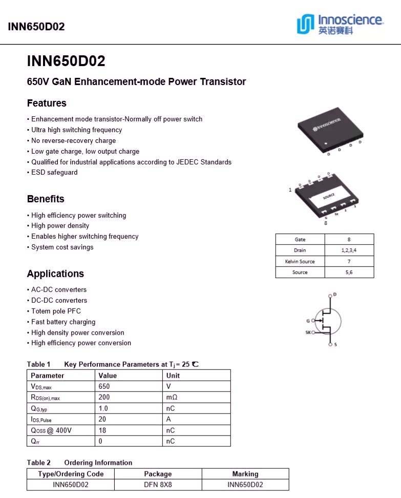 英諾賽科 INN650D02 詳細資料。
