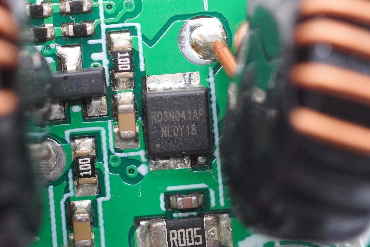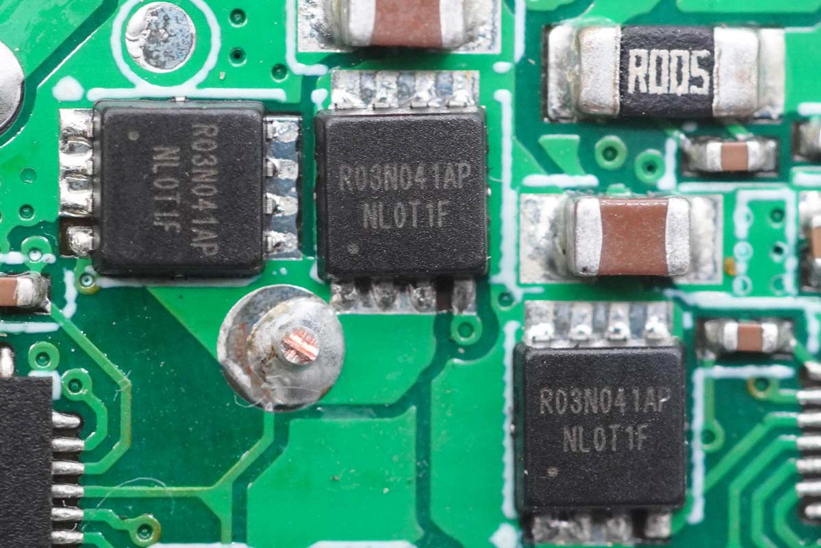 每顆智融SW3516H還各外掛兩顆R03N041AP MOS管輸出同步整流降壓。