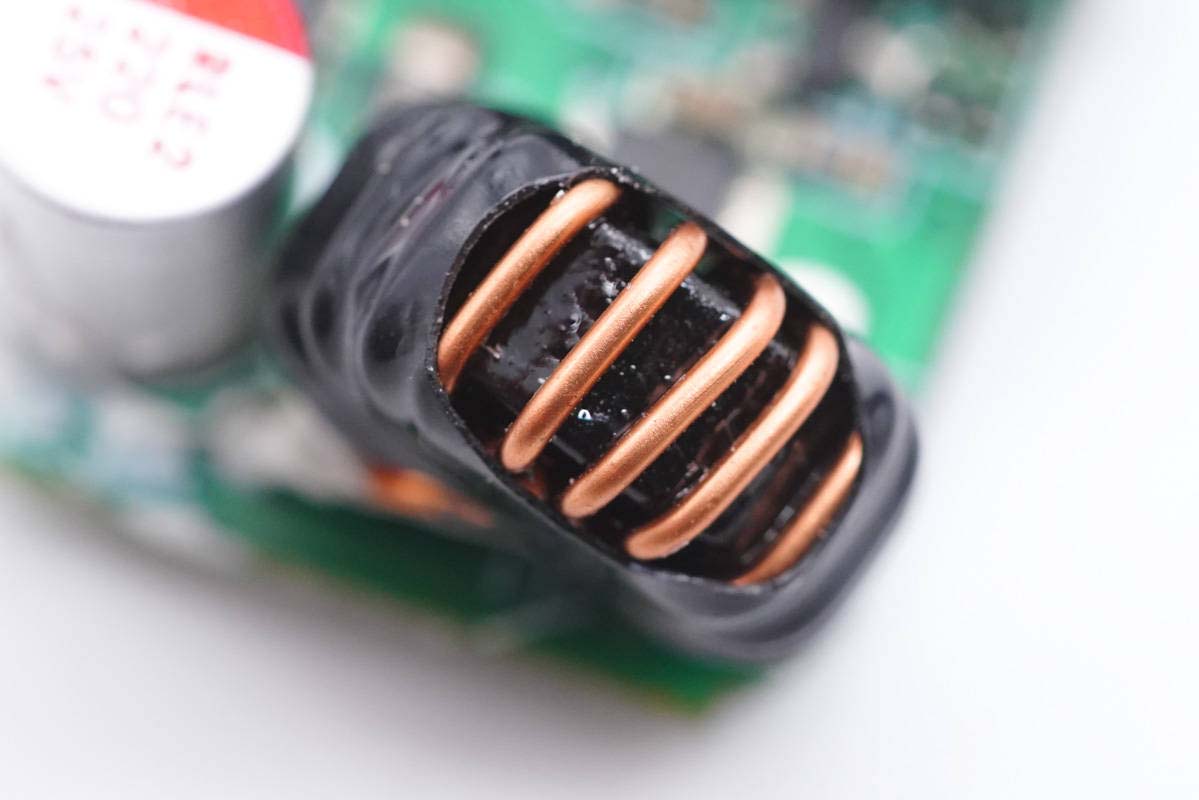 變壓器特寫,RM8磁芯,纏繞膠帶絕緣。