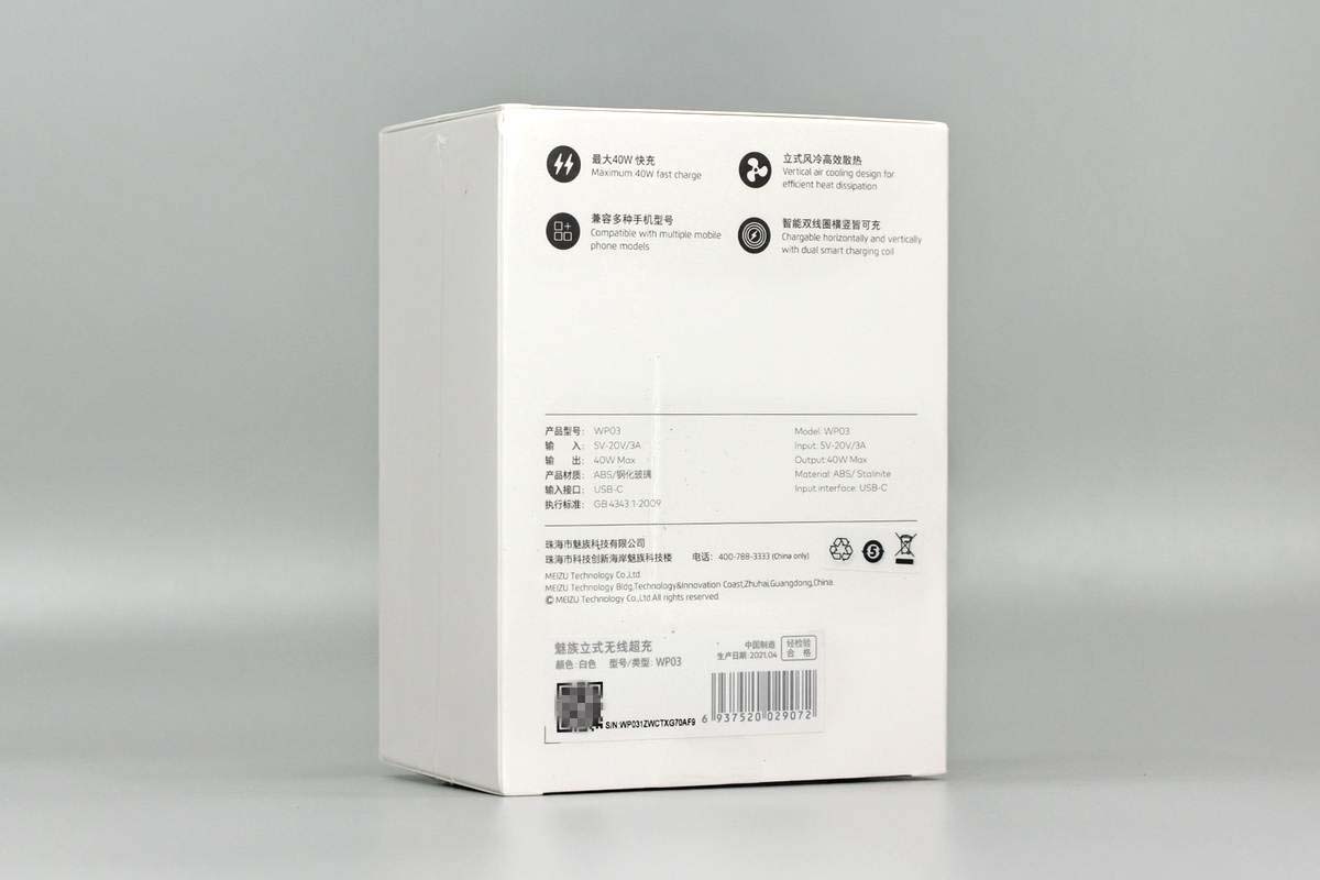 包裝盒為白色,設(shè)計(jì)也比較簡(jiǎn)潔,正面印有MEIZU品牌、無線充外觀和名稱。