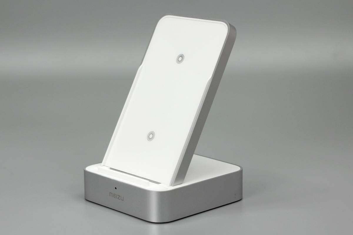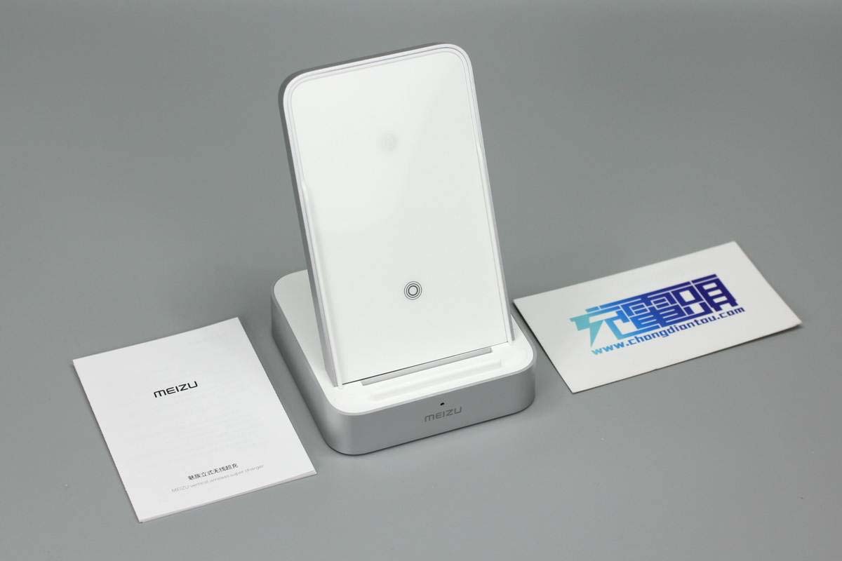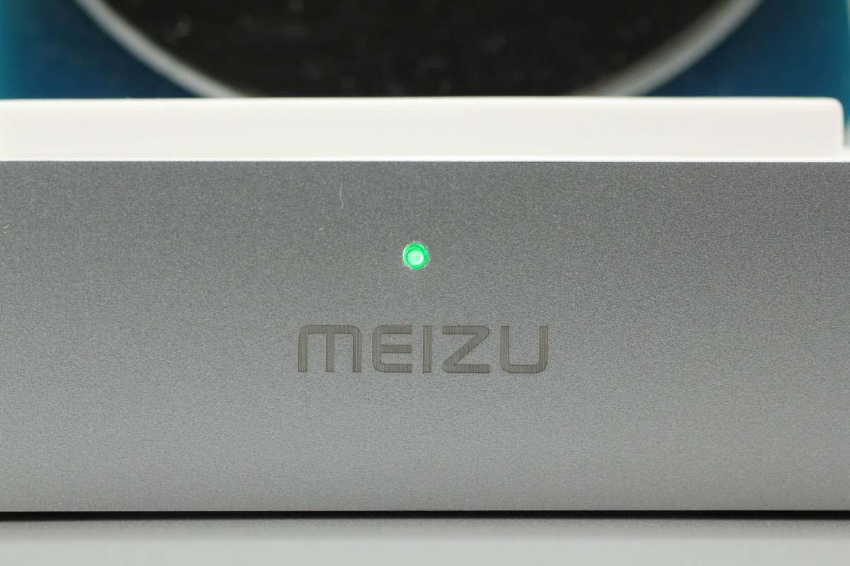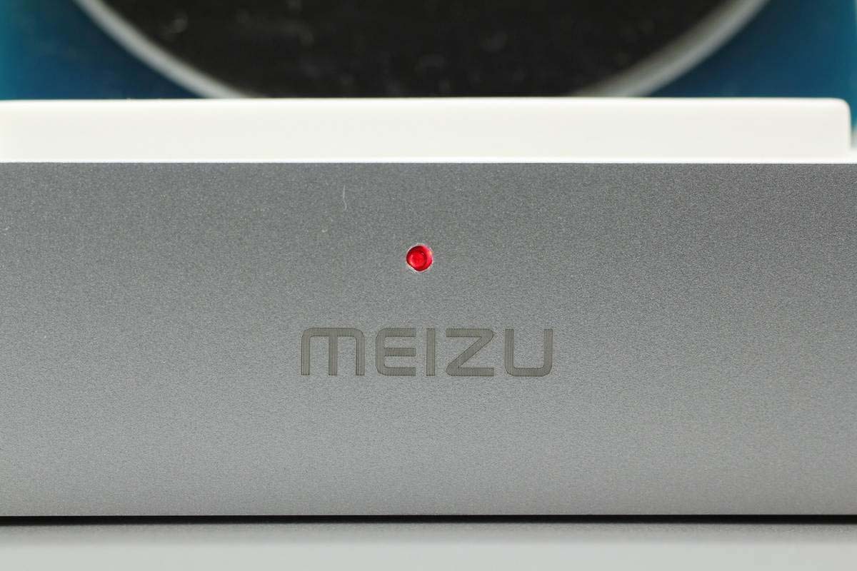 底座前端印有MEIZU品牌,并設(shè)有一顆LED充電指示燈。