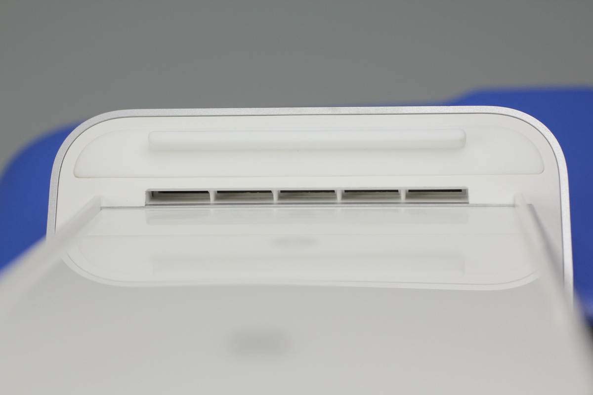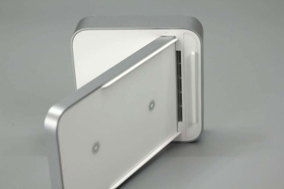 魅族這款無線充由底座和手機(jī)支撐板兩部分組成,支撐板正面是ABS材質(zhì)鋼化玻璃,十分光滑,支撐板和底座側(cè)身均噴砂銀灰色涂料進(jìn)行裝飾。