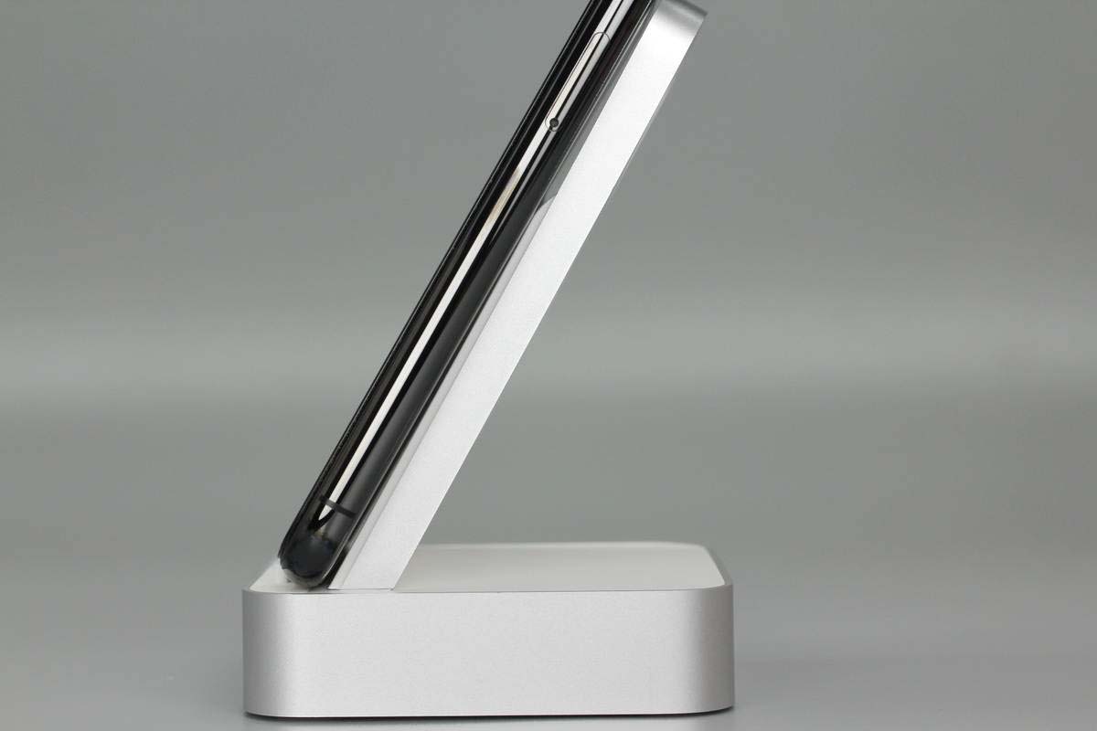 支撐板正面有兩個(gè)旋渦圖案,表示無線充區(qū)域,手機(jī)橫豎都能進(jìn)行無線充電。