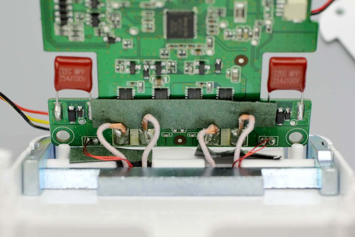 拆掉兩顆螺絲即可將底部外殼打開,風(fēng)扇使用卡扣進(jìn)行固定,并且風(fēng)扇和PCB板間有一塊白色塑料板進(jìn)行隔離。